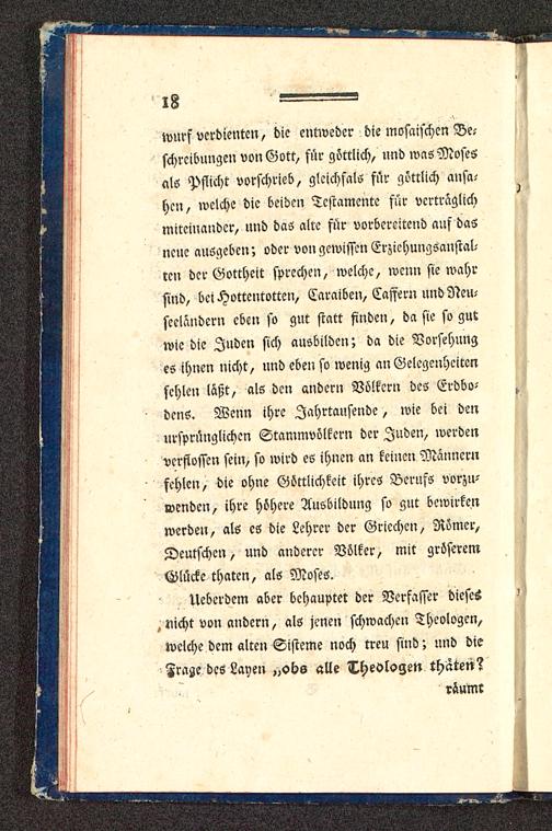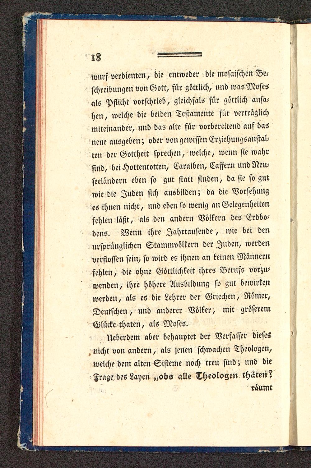 wurf verdienten, die entweder die mosaischen Be-schreibungen von Gott, für göttlich, und was Mosesals Pflicht vorschrieb, glcichfals für göttlich ansa-hen, welche die beiden Testamente für verträglichmiteinander, und das alte für vorbereitend auf dasneue ausgeben; oder von gewissen Erzichungsanstal.-rcn der Gottheit sprechen, welche, wenn sie wahrsind, bei Hottentotten, Caraibcn, Cassern und Neu-seeländern eben so gut statt finden, da sie so gutwie die Zuden sich ausbilden; da die Vorsehunges ihnen nicht, und eben so wenig an Gelegenheitenschien läßt, als den andern Völkern des Erdbo-dens. Wenn ihre Jahrtausende, wie bei denursprünglichen Stanimvölkcrn der Zuden, werdenverflossen sein, so wird es ihnen an keinen Männernfehlen, die ohne Göttlichkeit ihres Berufs vorzu-wcnden, ihre höhere Ausbildung so gut bewirkenwerden, als es die Lehrer der Griechen, Römer,Deutschen, und anderer Völker, mit gröseremGlücke thaten, als Moses.