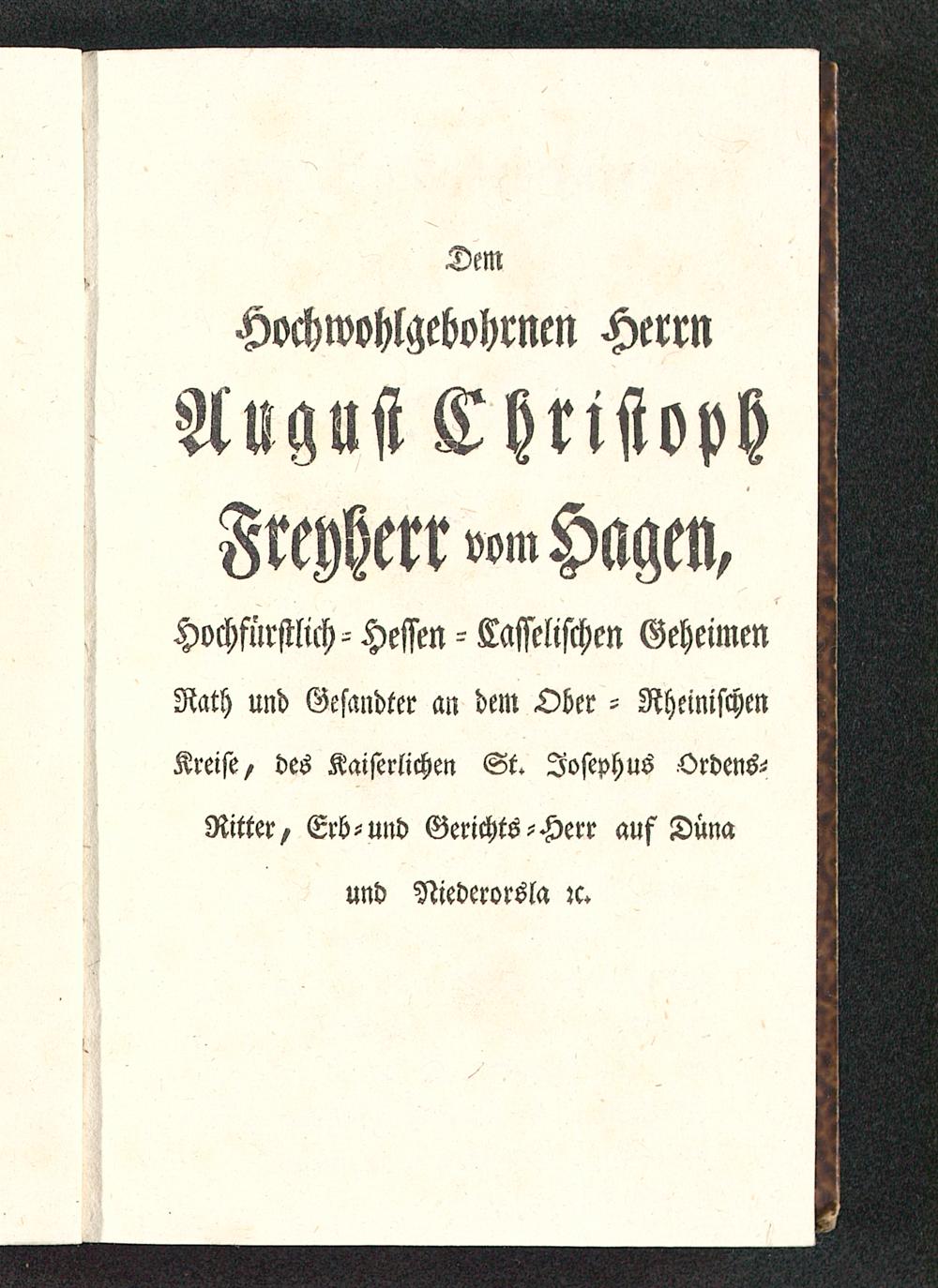 DemHochwohlgebohmen HerrnAnguß ChristophFrWrr°°m Hagen /Hochfürstlich- Hessen - Casseltschen GeheimenRath und Gesandter an dem Ober - RheinischenKreist/ des Kaiserlichen St. Josephus Qrdens--Ritter, Erb-und Gerichts-Herr auf Düna und Niederorsla zc.