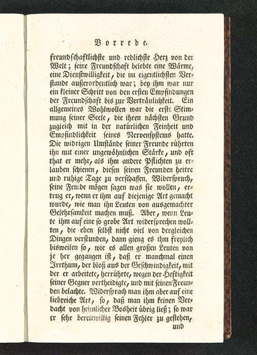 freundschaftlichste und redlichste Herz von derWelt; seine Freundschaft belebte eine Warme,eine Dienstwilligkeit, die im eigentlichsten Ver-stände außerordentlich war; bey ihm war nurein kleiner Schritt von den ersten Empfindungender Freundschaft bis zur Vertraulichkeit. Einallgemeines Wohlwollen war die erstc Stim-mung seiner Seele, die ihren nächsten Grundzugleich mit in der natürlichen Feinheit undEmpfindlichkeit seines Nervensystems hatte.Die widrigen Umstände seiner Freun.de rührtenihn mit einer ungewöhnlichen Stärke, und oftthat er mehr, als ihm andere Pflichten zu er-lauben schienen, diesen seinen Freunden heitreund ruhige Tage zu verschaffen. Widerspruch,seine Feinde mögen sagen was sie wollen, er-trug er, wenn er ihm auf diejenige Art gcmachtwurde, wie man ihn Leuten von ausgemachterGelehrsamkeit machen muß. Aber, wenn Leu-te ihm auf eine so grobe Art widersprechen woll-ten, die eben selbst nicht viel von dergleichenDingen verstunden, dann gieng es ihm freylichbisweilen so, wie es allen großen Leuten vonje her gegangen ist, daß er manchmal einenIrrthum, der bloß aus der Geschwindigkeit, mitder er arbeitete, herrührte, wegen der Heftigkeitseiner Gegner vertheidigte, und mit seinenFreun-den belachte. Widersprach man ihm aber auf eineliebreiche Art, so, daß man ihm keinen Ver-dacht von hei-nlicher Bosheit übrig ließ; so warer sehr bereitwillig seinen Fehler zu gestehen,