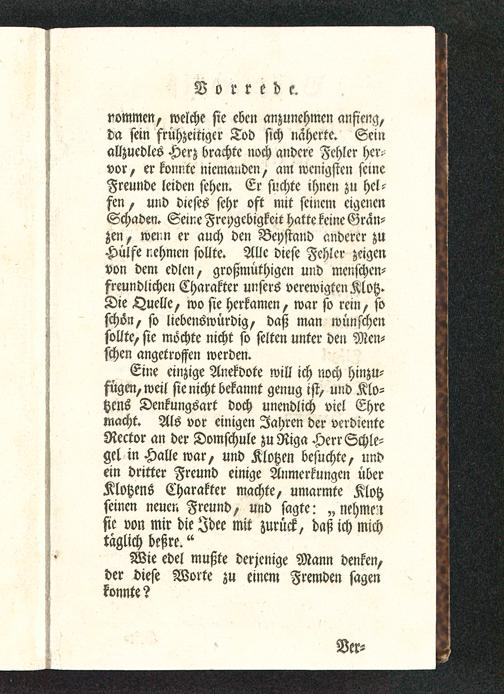 Eine einzige Anekdote will ich noch hinzu-fügen, weil sie nicht bekannt genug ist, und Klo-tzens Denkungsart doch unendlich viel Ehremacht. Als vor einigen Iahren der verdienteRector an der Domschule zu Riga Herr Schle-gel in Halle war, und Klotzen besuchte, undein dritter Freund einige Anmerkungen überKlotzens Charakter machte, umarmte Klotzseinen neuen Freund, und sagte: „nehmensie von mir die Idee mit zurück, daß ich michtäglich deßre.«