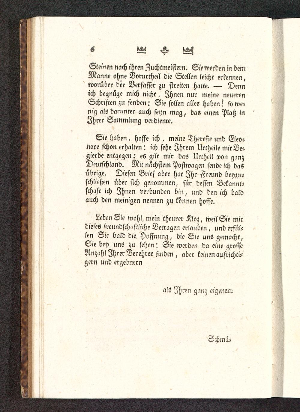 Sie haben, hoffe ich , meine Theresis und Eleo»nore schon erhalten : ich sehe Ihrem Urtheile mitBe-gierde entgegen; e6 gilt mir das Urtheil von ganzDeutschland . Mit nächstem Postwagen sende ich daSübrige. Diesen Brief aber hat Ihr Freund beyzusschließen über sich genominen, für dessen Bekannt-sch.ift ich Ihnen verbunden bin, und den ich baldauch den meinigen nennen zu können hoffe.