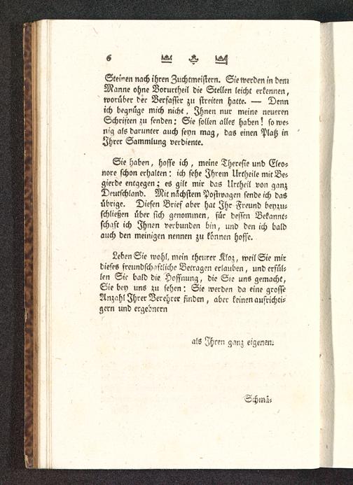 Leben Sie wohl, mein theurer Kloz, weil Sie mirdieses freundschaftlich? Betragen erlauben, und erfül-len Sie bald die Hoffnung, die Sie unS gemacht,Sie bey uns zu sehen: Sie werden da eine grosseAnzahl Ihrer Verehrer finden , aber keinen aufrichti-gern und ergebnem