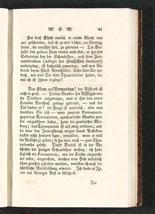 Hat doch Klem neulich in einem Blatte vonnur geschrieben, daß ich zu edel dachte, an Streitig«keiten , die verjährt sind, zu gedenken Der Ver-fasser des grünen Huts nennet mich edel: er hat seinSekretanst bey der Schaubühne, und seine Inte«rimsdirektion (^KiZio hat HeufeldM beurlaubt)niedergelegt, ist katholisch geworden, und nun Se-kretär beym Fürst Kevenhüller. Schreiben Sie mirdoch, wie weit Sie seine Theatcrblaccer haben, da«mit ich sie Ihnen ergänze!