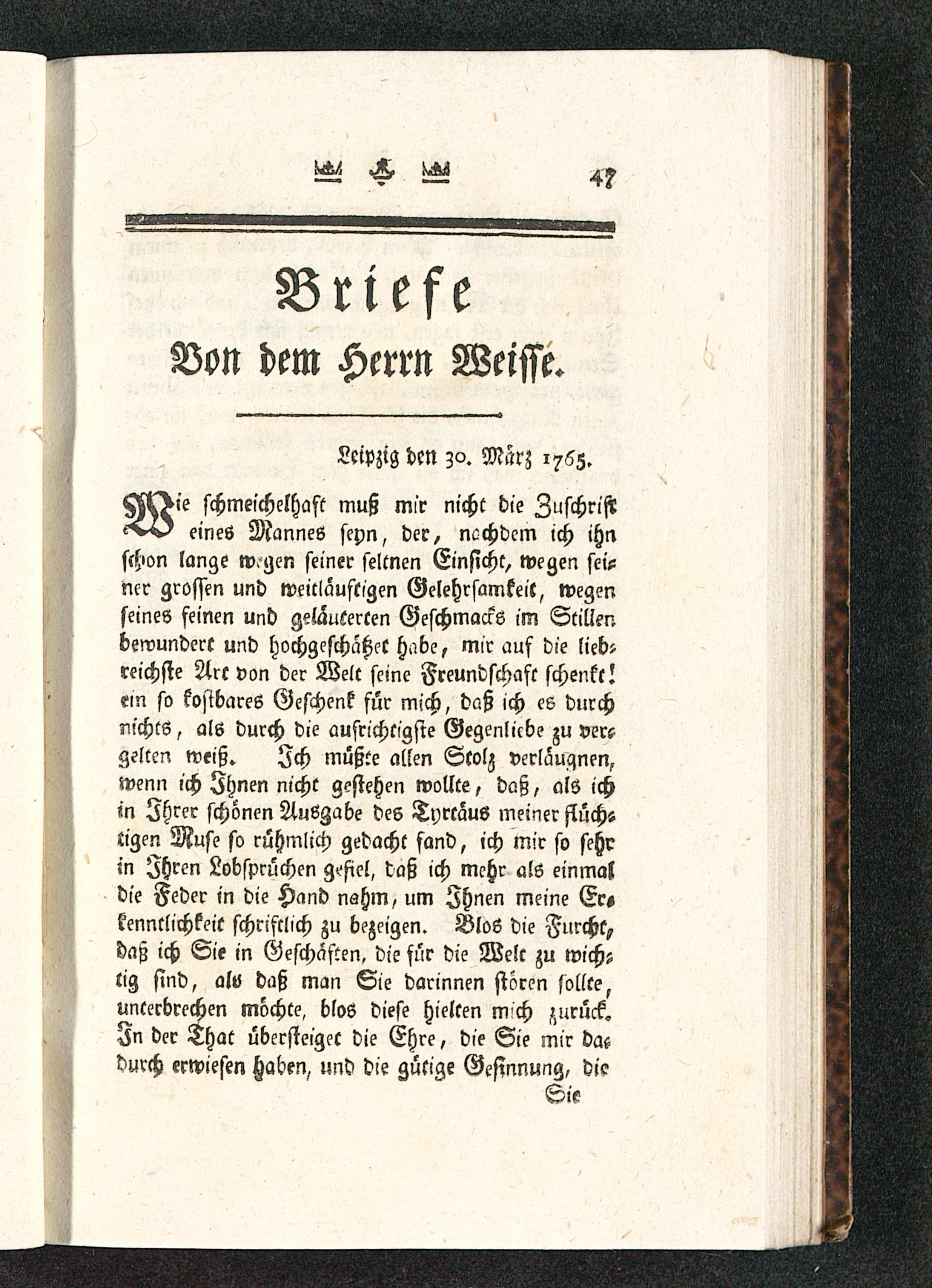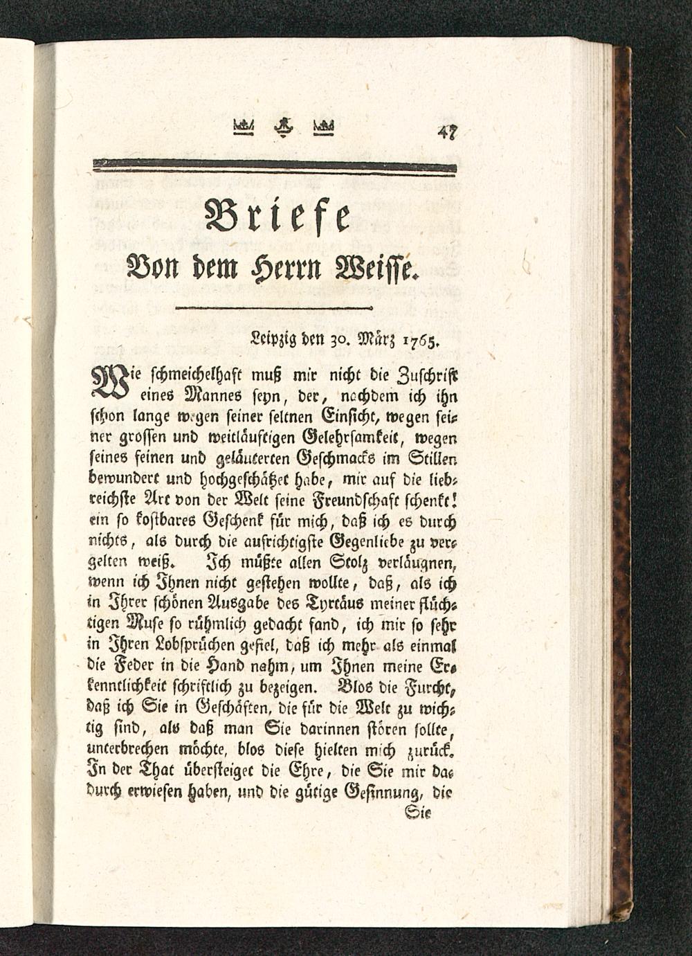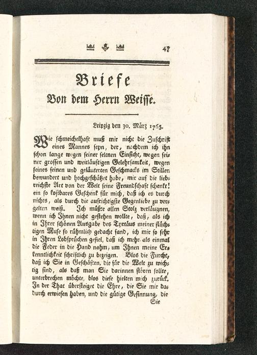 H^>i'e schmeichelhaft muß mir nicht die Zuschrift--v-A eines Mannes seyn, der, ncchdcm ich ihnschon lange wgen seiner seltnen Einsicht, wegen sei-ner grossen und weicläuftigen Gelehrsamkeil, wegenseines feinen und geläuterten Geschmacks im Stillenbewundert und hochgeschätzet habe, mir auf die lieb-reichste Art von der Welt seine Freundschaft schenkt!ein so kostbares Geschenk für mich, daß ich es durchnichts, als durch die aufrichtigste Gegenlicbe zu ver?gelten weiß. Ich müßte allen Stolz verlauqnen,wenn ich Ihnen nicht gestehen wollte, daß, als ichm Ihrer schönen Ausgabe des Tyrtaus meiner flüchstigen Muse so rühmlich gedacht fand, ich mir so sehrin Zhrcn Lobsprüchen gefiel, daß ich mehr als einmaldie Feder in die Hand nahm, um Ihnen meine Er«kenntlichkeit schriftlich zu bezeigen. Blos die Furcht,daß ich Sie in Geschäften, die für die Welt zu wichstig sind, alv daß man Sie darinnen stören sollte,unterbrechen möchte, blos diese hielten m'ch zurück.In der That übersteiget die Ehre, die Sie mir dacdurch erwiesen Haben, und die gütige Gesinnung, die