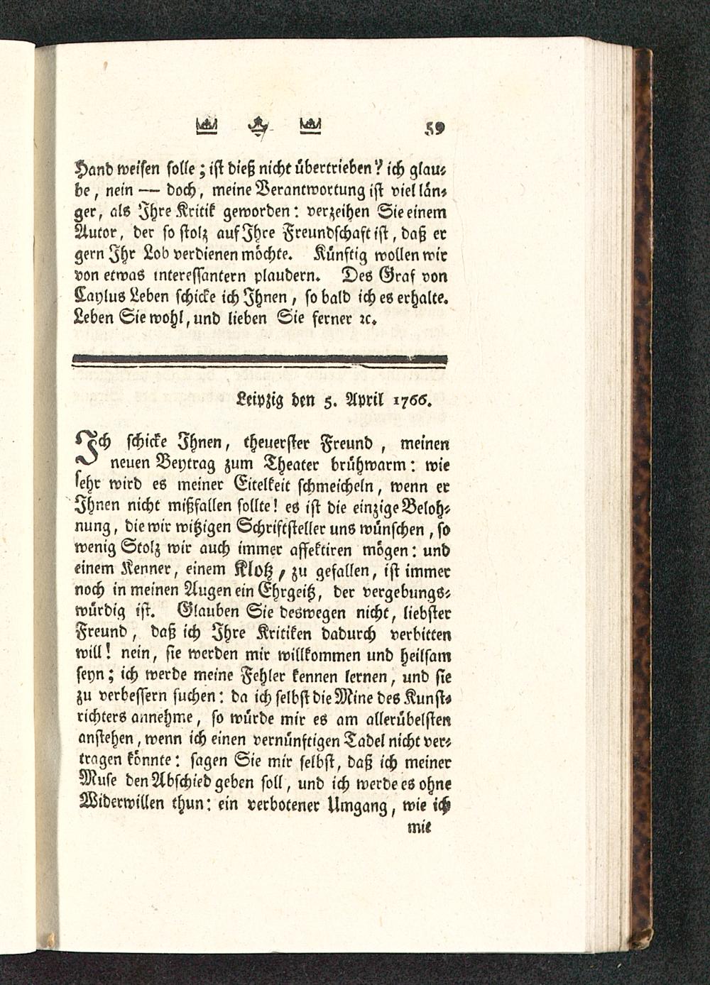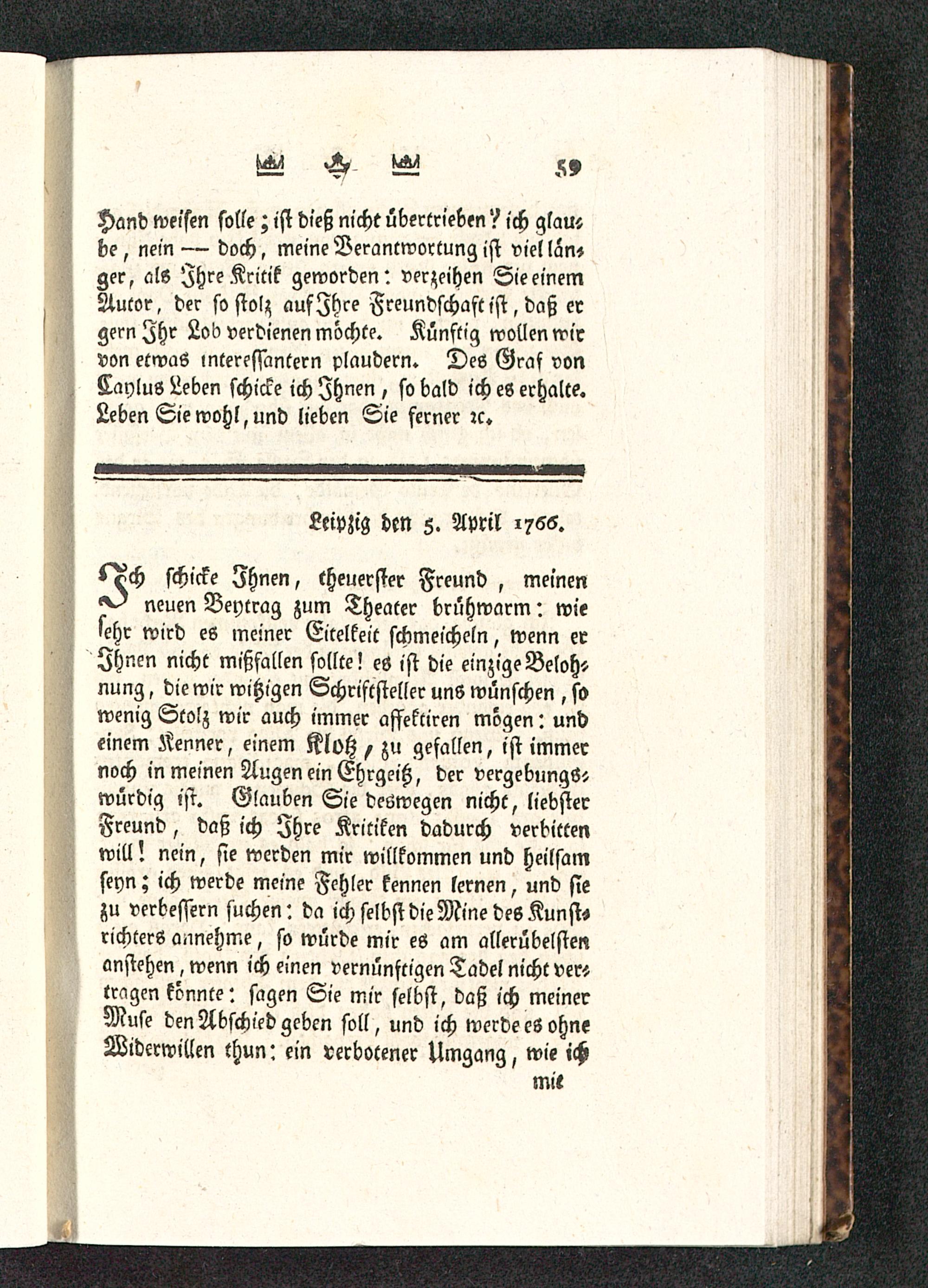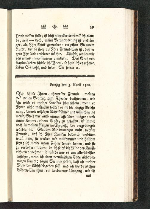 l^ch schicke Ihnen, theuerster Freund, meinenneuen Beytrag zum Theater brühwarm: wiesehr wird es meiner Eitelkeit schmeicheln, wenn erIhnen nicht mißfallen sollte! es ist die einzig? Beloh-nung , die wir witzigen Schriftsteller uns wünschen , sowenig Stolz wir auch immer affektiren mögen: undeinem Kenner, einem Klotz , zu gefallen, ist immernoch in meinen Augen ein Ehrgeiß, der vergebungStwürdig ist. Glauben Sie deswegen nicht, liebsterFreund, daß ich Ihre Kritiken dadurch verbittenwill! nein, sie werden mir willkommen und heilsamseyn; ich werde meine Fehler kennen lernen, und siezu verbessern suchen: da ich selbst die Mine des Kunst»richterS annehme, so würde mir cö am allerübelstenanstehen, wenn ich einen vernünftigen Tadel nicht ver»tragen könnte: sagen Sie mir selbst, daß ich meinerMuse den Abschied geben soll, und ich werde es ohneWiderwillen thun: ein verbotener Umgang, wie ich