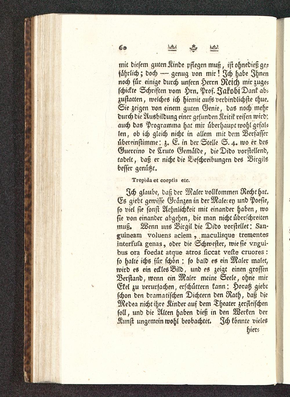 mit diesem guten Kinde pflegen muß, ist ohnedicß ge-fährlich ; doch — genug von mir? Ich habe Ihnennoch für einige durch unsern Herrn Reich mir zuge-schickte Schriften vom Hrn. Prof. Jakobt Dank ab-zustatten, welches ich hiemit ausö verbindlichste thue.Sie zeigen von einem guten Genie, das noch mehrdurch die Ausbildung einer gesunden Kritik reifen wird:auch das Programina hat mir überhaupt wohl gefal-len, ob ich gleich nicht in allem mit dem Verfasserübereinstimme: z. E. in der Stelle S. 4. wo er desGuercino de Cruco Gemälde, die Dido vorstellend,tadelt, daß er nicht die Beschreibungen des Birgilsbesser genutzt.