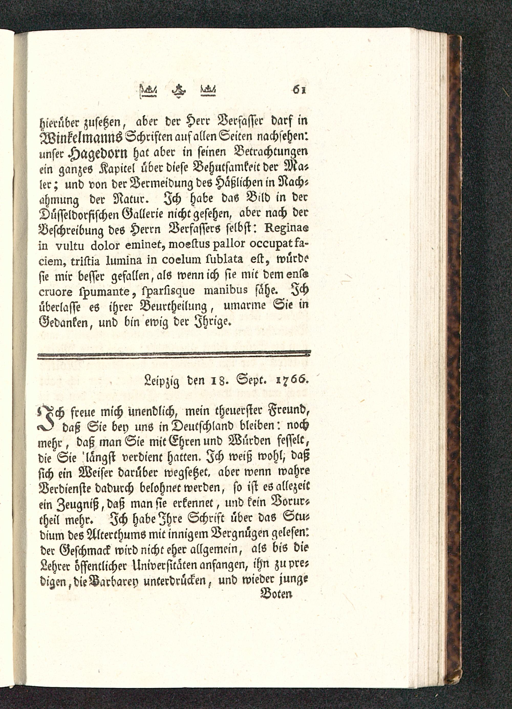 hierüber zuseßen, aber der Herr Verfasser darf inWinkelmanns Schriften auf allen Seiten nachsehen:unser Hagedorn hat aber in seinen Betrachtungenein ganzes Kapitel überdies? Behutsamkeit der Ma-ler ; und von der Vermeidung des Haßlichen in Nach-ahmung der Natur. Ich habe daö Bild in derDüsseldorfischen Gallerie nicht gesehen, aber nach derBeschreibung des Herrn Verfassers selbst: Ks^inssin vulru 6o1or sminst, mosüug pzllor occupztka-ciem, rriltia lumina in cosluin lublstz eü, würdesie mir besser gefallen, als wenn ich sie mit demsnl«cruors 5xum3nte, lxzrlisguL msnibus sahe. Ichüberlasse es ihrer Beurtheilung, umarme Sie inGedanken, und bin ewig der Ihrige.