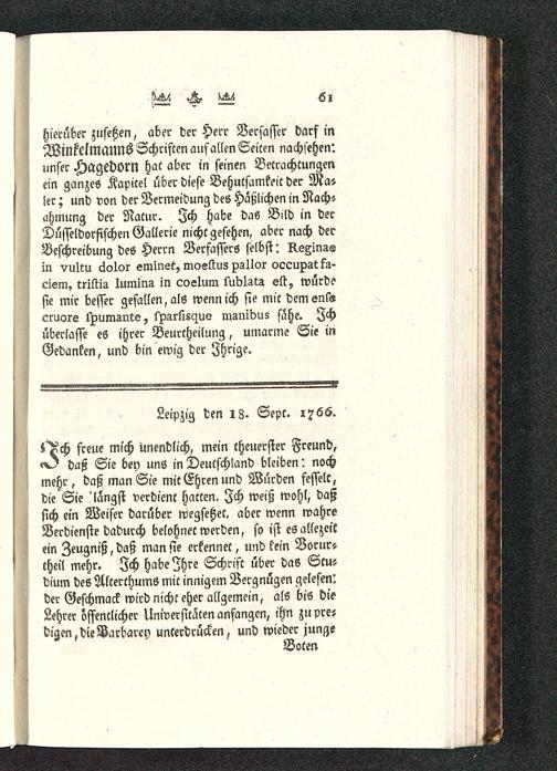 t^ch freue mich unendlich, mein theuerster Freund,daß Sie bey uns in Deutschland bleiben: nochmehr, daß man Sie mit Ehren und Würden fesselt,die Sie 'langst verdient hatten. Ich weiß wohl, daßsich ein Weiser darüber wegsehet, aber wenn wahreVerdienste dadurch belohnet werden, so ist es allezeitein Zeugniß, daß man sie erkennet, und kein Vorur-theil mehr. Ich habe Ihre Schrift über daö Stu-dium des Alterthums mit innigem Vergnügen gelesen:der Geschmack wird nicht eher allgemein, als bis dieLehrer öffentlicher Universitäten anfangen, ihn zu pre-digen, die Barbarei) unterdrücken, und wieder junge