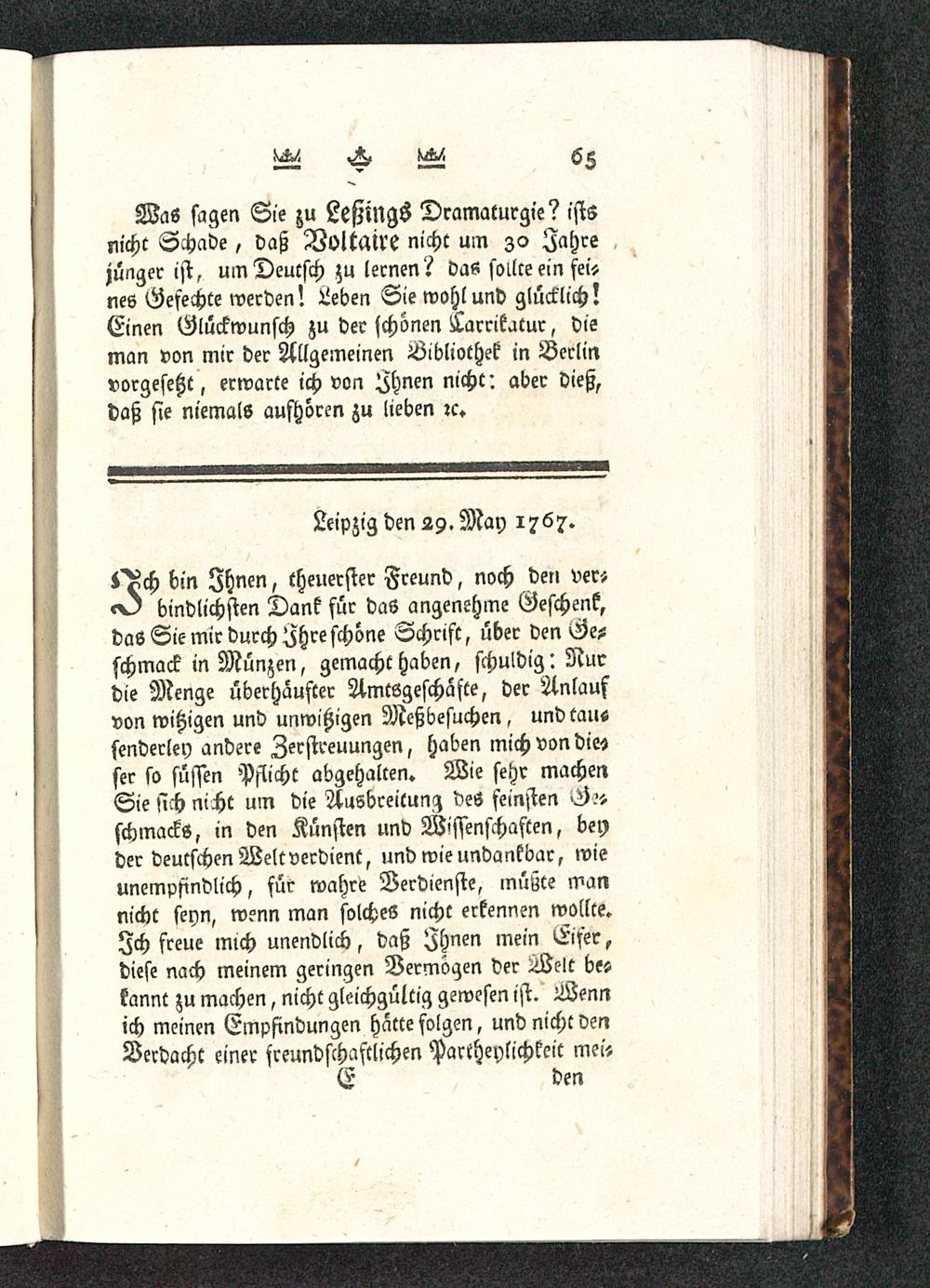 t^ch bin Ihnen, theuerster Freund, noch den ver«o) Kindlichsten Dank für das angenehme Geschenk,das Sie mir durch Ihre schöne Schrift, über den Ge-schmack in Münzen, gemacht haben, schuldig: Nurdie Menge überhaufter AmtSgeschafte, der Anlaufvon witzigen und unwißigen Meßbesuchen , und tau«senderley andere Zerstreuungen, haben mich von die»ser so süssen Pflicht abgehalten. Wie sehr machenSie sich nicht um die Ausbreitung des feinsten G?5schmacks, in den Künsten und Wissenschaften, beyder deutschen Weltverdient, und wie undankbar, wieunempfindlich, für wahre Verdienste, müßte mannicht seyn, wenn man solches nicht erkennen wollte.Ich freue mich unendlich, daß Ihnen mein Eifer,diese nach meinem geringen Vermögen der Weit beskannt zu machen, nicht gleichgültig gewesen ist. Wennich meinen Empfindungen hatte folgen, und nicht denVerdacht einer freundschaftlichen Parteylichkeit mei«E den