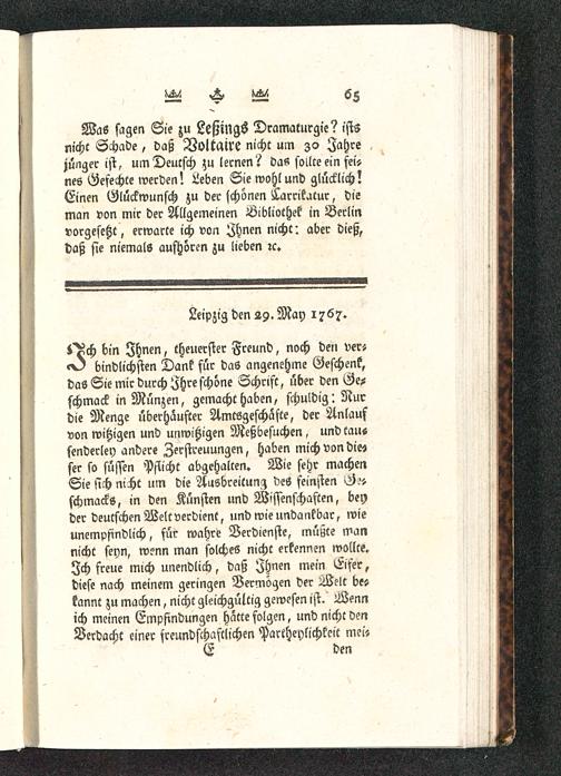 Was sagen Sie zu Leßings Dramaturgie? istsnicht Schade, daß Voltaire nicht um AO Jahrejünger ist, um Deutsch zu lernen ? das sollte ein feisnes Gefechte werden! Leben Sie wohl und glücklich!Einen Glückwunsch zu der schönen ^arrikatur, dieman von mir der Allgemeinen Bibliothek in Berlin vorgesetzt, erwarte ich von Ihnen nicht: aber dieß,daß sie niemals aushören zu lieben ;c.