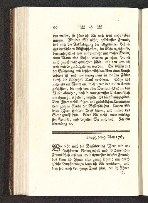 den wollen, so hätte ich Sie noch weit mehr lobenmüssen. Glauben Sie nicht, geliebtester Freund,daß mich die Ankündigung der allgemeinen Biblio»chek der schönen Wissenschaften, im Meßverzeichnisse,beunruhiget: es war mir vielmehr eine wahre Freude,einen Mann eine Bahn betreten zu sehen, der ichmich gewiß nicht gewachsen fühle, und von dem ichweit würde zurückgelassen werden. Sie wissen ausder Erfahrung, wie beschwerlich das Amt eines Kunst»richters ist, und wie wenig man in meisten Fallendurch die Wahrheit Dank verdienet. Sahe ichsnicht alö ein Mittel an, mich unter den vielen AmtS»geschaften, die mich von aller Vertraulichkeit mit denMusen abziehen, noch in einer gewissen Bekanntschaftmit ihnen zu erhalten, so hatte ichs langst aufgegeben.Bey Ihrer weitlauftigcn und grundlichen Kenntniß indem ganzen Reiche der Wissenschaften, können SieZeiche Ihren Feinden Troß bieten, und immer desSiegs gewiß seyn. Leben Sie wohl, mein würdig-ster Freund, und behalten Sie mich lieb. Ich binlebenslang ic«