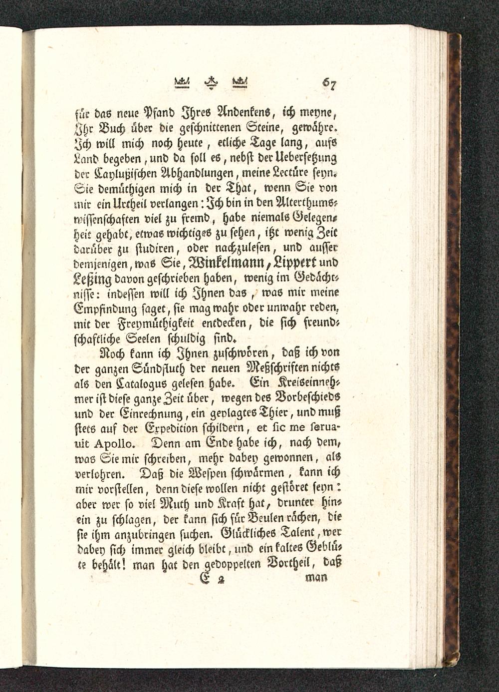 für das neue Pfand Ihres Andenkens, ich meyne,Zhr Buch über die geschnittenen Steine, gewähre,^ch will mich noch heute , etliche Tage lang, aufsLand begeben, und da soll eö, nebst derUeberseßungder Caylußischen Abhandlungen, meine Lcctüre seyn.Sie demüthigen mich in der That, wenn Sie vonmir ein Urtheil verlangen: Ich bin in den Alterthums?Wissenschaften viel zu fremd, habe niemals Gelegen-heit gehabt, etwas wichtiges zu sehen, ißt wenig Zeitdarüber zu studiren, oder nachzulesen, und ausserdemjenigen, waS Sie, WtNkelMaNN, Ll'ppttt undLeßlNg davon geschrieben haben, wenig im Gedacht-nifse: indessen will ich Ihnen das , was mir meineEmpfindung saget, sie mag wahr oder unwahr reden,mit der Freymüthgkeit entdecken, die sich freund»schaftiiche Seelen schuldig sind.