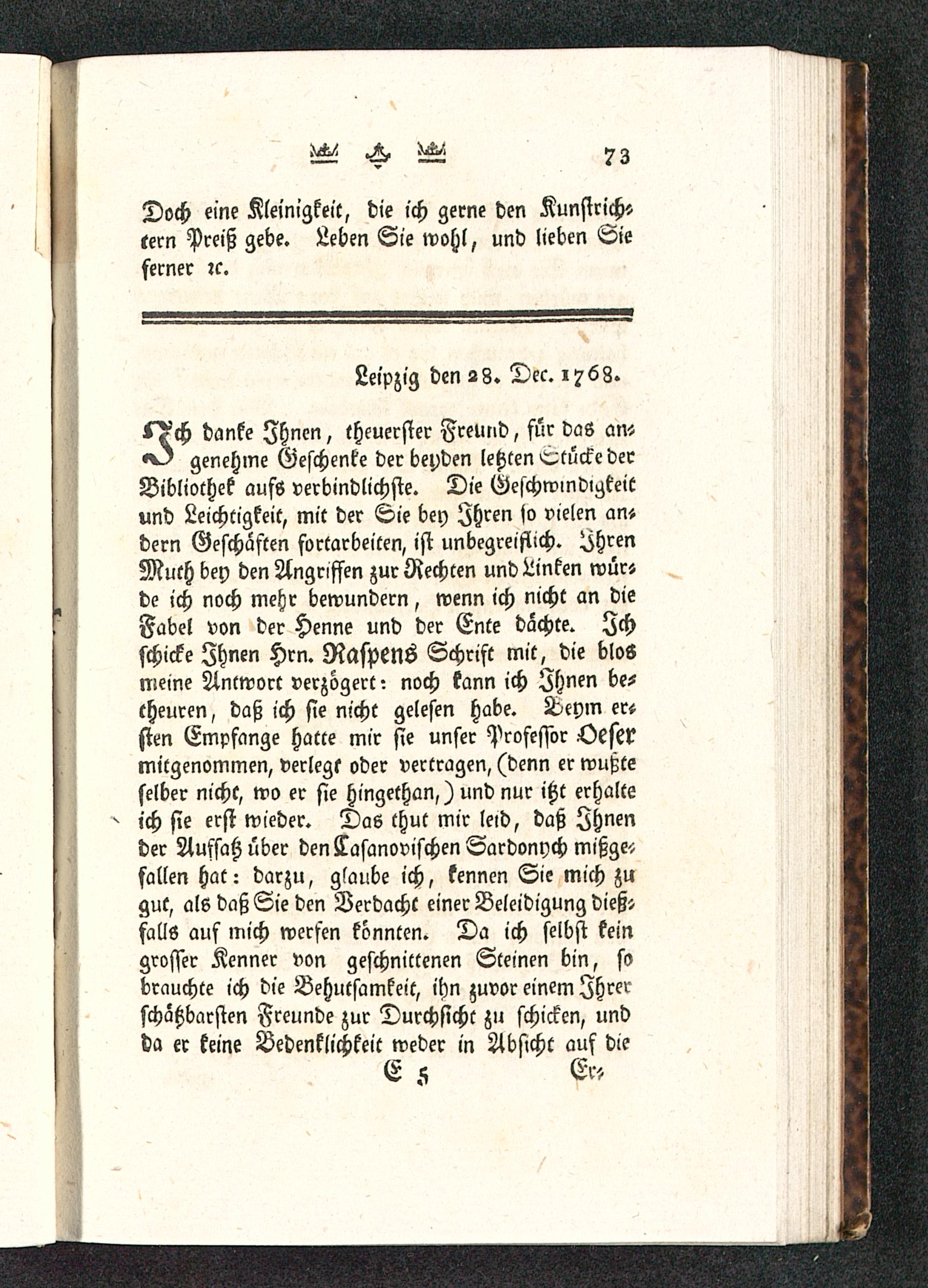 L?ch danke Ihnen, theuerster Freund, für das an«genehme Geschenke der beyden letzten Stücke derBibliothek aufö verbindlichste. Die Geschwindigkeitund Leichtigkeit, mit der Sie bey Ihren so vielen an«dem Geschäften fortarbeiten, ist unbegreiflich, ^hrenMuth bey den Angriffen zur Rechten und Linken wür-de ich noch mehr bewundern, wenn ich nicht an dieFabel von der Henne und der Ente dachte. Ichschicke Ihnen Hrn. Raspens Schrift mit, die blosmeine Antwort verzögert: noch kann ich Ihnen be-theuren, daß ich sie nicht gelesen habe. Beym er-sten Empfange hatte mir sie unser Professor Oesermitgenommen, verlegt oder vertragen, (denn er wußteselber nicht, wo er sie hingethan,) und nur ißt erhalteich sie erst wieder. Das thut mir leid, daß Ihnender Aufsaß über denTasanovischen Sardonych mißge«fallen hat: darzu, glaube ich, kennen Sie mich zugut, ale daß Sie den Verdacht einer Beleidigung dieß«falls auf mich werfen könnten. Da ich selbst keingrosser Kenner von geschnittenen Steinen bin, sobrauchte ich die Behutsamkeit, ihn zuvor einem Ihrerschaßbarsten Freunde zur Durchsicht zu schicken, undda er keine Bedenklichkeit weder in Absicht auf die
