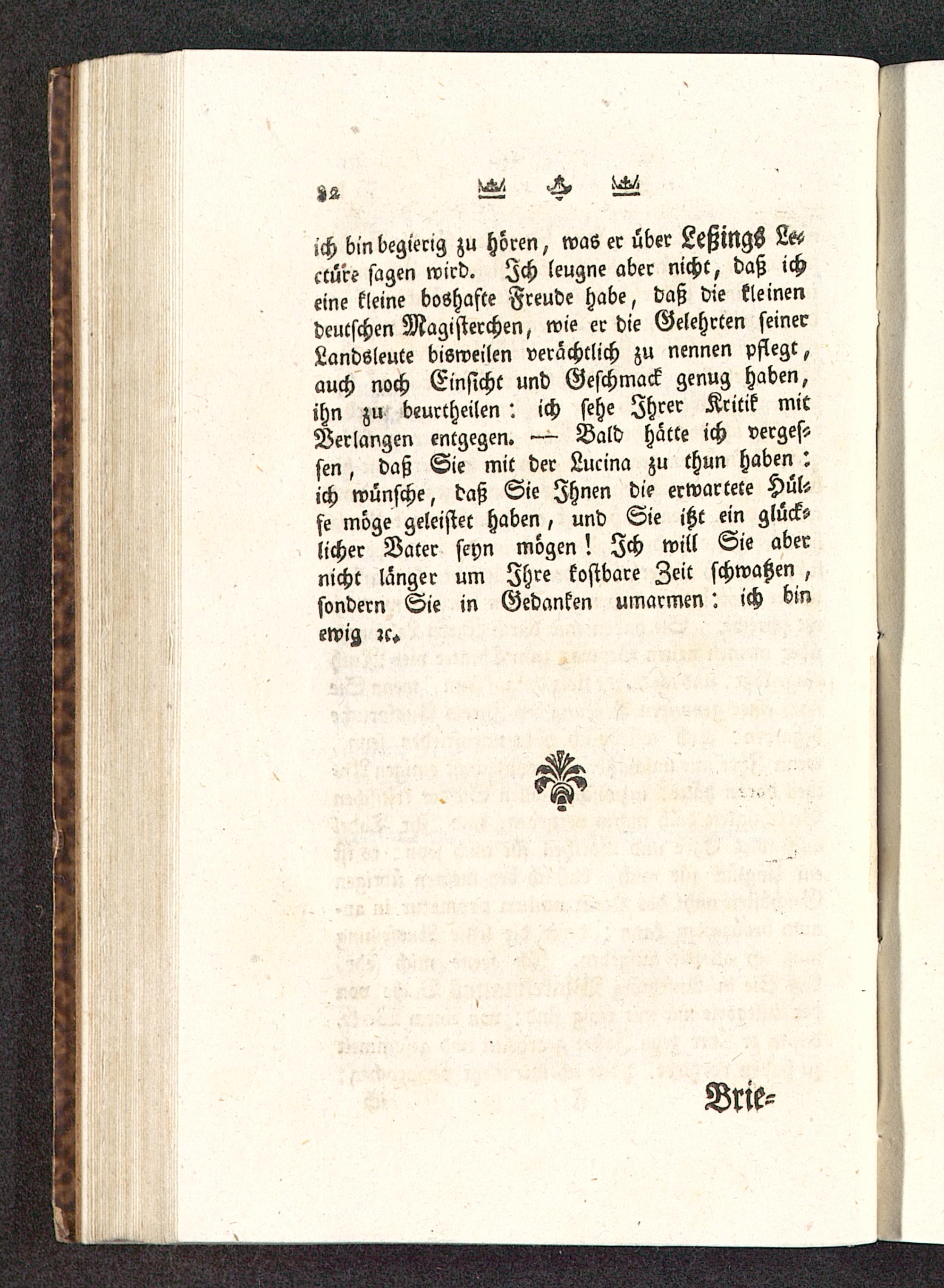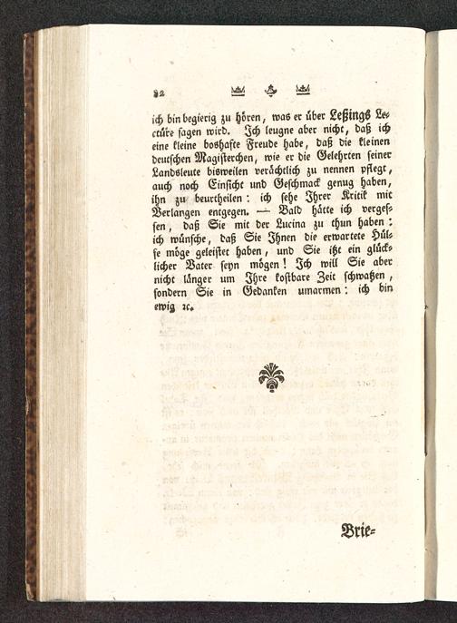 ich bin begierig zu hören, was er über LeßlNgs Le^ctü're sagen wird. Ich leugne aber nicht, daß icheine kleine boshafte Freude habe, daß die kleinendeutschen Magisterchen, wie er die Gelehrten seinerLandsleute bisweilen verächtlich zu nennen pflegt,auch noch Einsicht und Geschmack genug haben,ihn zu beurtheilen: ich sehe Ihrer Kritik mitVerlangen entgegen. -— Bald hätte ich verges-sen , daß Sie mit der Lucina zu thun haben:ich wünsche, daß Sie Ihnen die erwartete Hül-se möge geleistet haben, und Sie ißt ein glückslicher Vater seyn mögen! Ich will Sie abernicht langer um Ihre kostbare Zeit schwatzen,sondern Sie in Gedanken umarmenich binewig ,c.