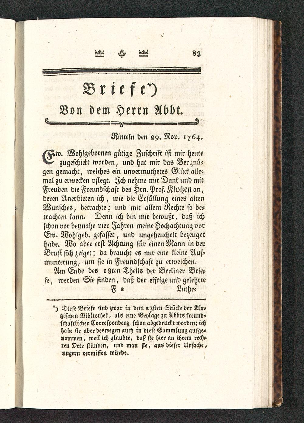 Diese Briefe sind ;war in dem -zsten Stücke der Klo-tzischen Bibliothek, als eine Beylage zu Abbts freund?schaftlicher Corresvonvenz, schon abgedruckt worden? ichhabe sie aber deswegen auch in diese Sammlung aufge-nommen, weil ich glaubte, daß sie hier an ihrem rech-ten Orte stünden, und man sie, aus dieser Ursache,«ngern vermissen wmv«.