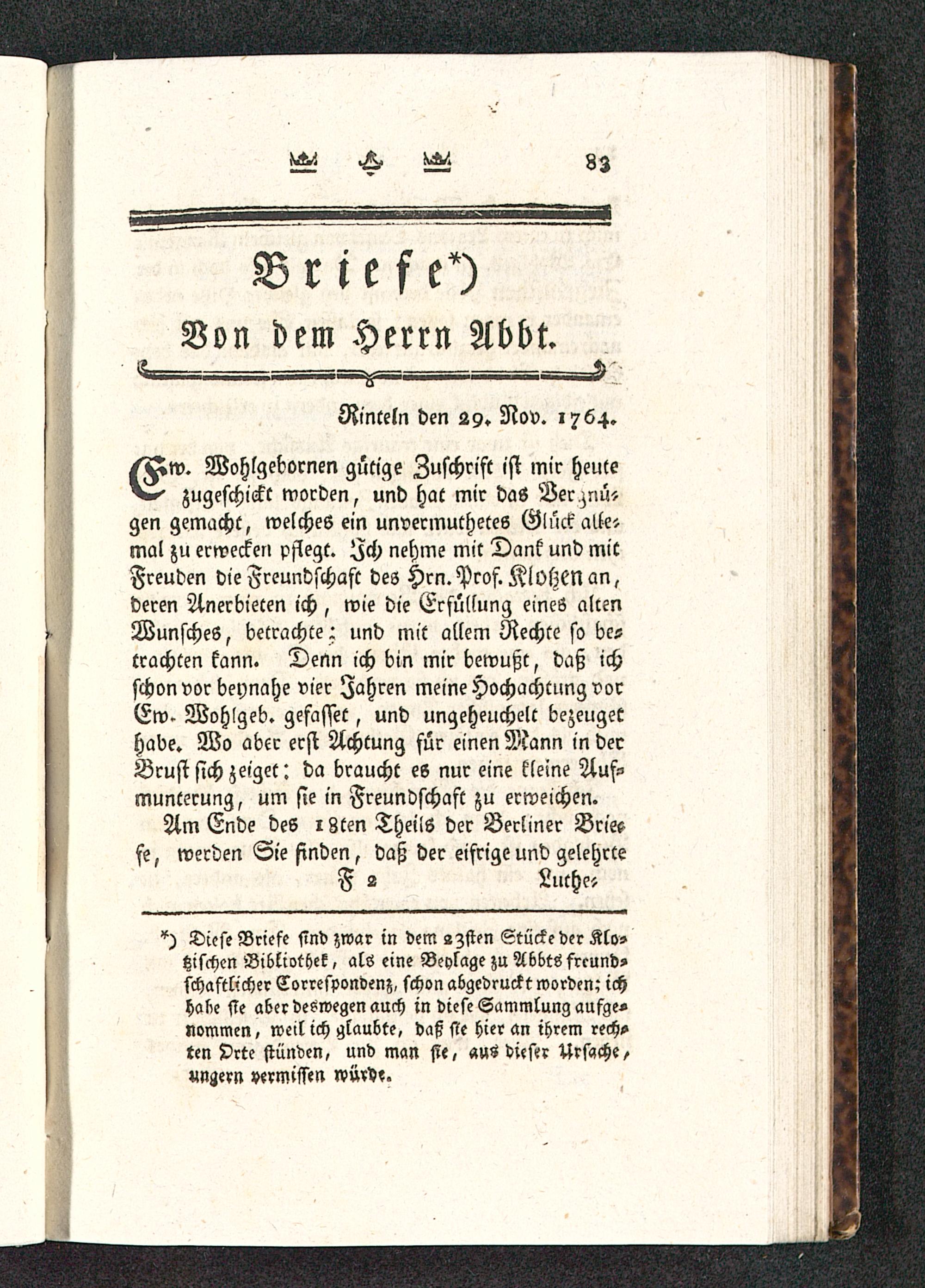 /Aw. Wohlgebornen gütige Zuschrift ist mir heutezugeschickt worden, und hat mir das Ver.znü»gen gemacht, welches ein unvermuthetes Glück alle-mal zu erwecken pflegt. Ich nehme mit Dank und mitFreuden die Freundschaft des Hrn. Prof. Kl0lM an,deren Anerbieten ich, wie die Erfüllung eines alcenWunsches, betrachte : und mit allem Rechte so be-trachten kann. Denn ich bin mir bewußt, daß ichschon vor beynahe vier Iahren meine Hochachtung vorEw. Wohlgeb. gefasset, und ungeheuchelt bezeugethabe. Wo aber erst Achtung für einen Mann in derBrust sich zeigetda braucht es nur eine kleine Auf-munterung, um sie in Freundschaft zu erweichen.