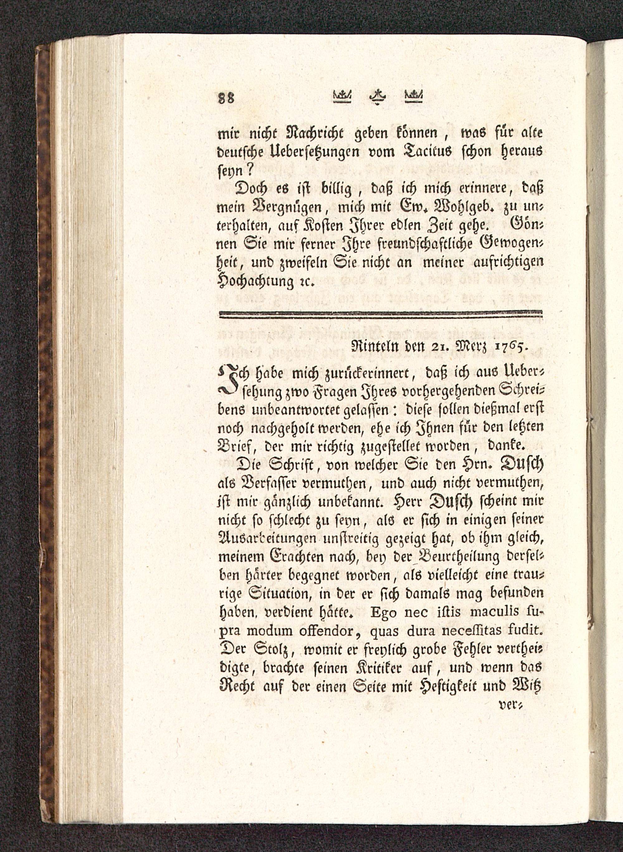 Die Schrift, von welcher Sie den Hrn. Dvfthals Verfasser vermuthen, und auch nicht vermuthen,ist mir ganzlich unbekannt. Herr Dusch scheint mirnicht so schlecht zu seyn, als er sich in einigen seinerAusarbeitungen unstreitig gezeigt hat, ob ihm gleich,meinem Erachten nach, bey der Beurtheilung dersel-ben harter begegnet worden, als vielleicht eine trau-rige Situation, in der er sich damals mag befundenhaben, verdient hatte. Tgo vsc Ms msculis 5u>xrz moclum oKenclor, <zuas clura nsesüitss 5uc!it.Der Stolz, womit er freylich grobe Fehler verthei;digte, brachte seinen Kritiker auf, und wenn daSRecht auf der einen Seite mit Heftigkeit und Wiß