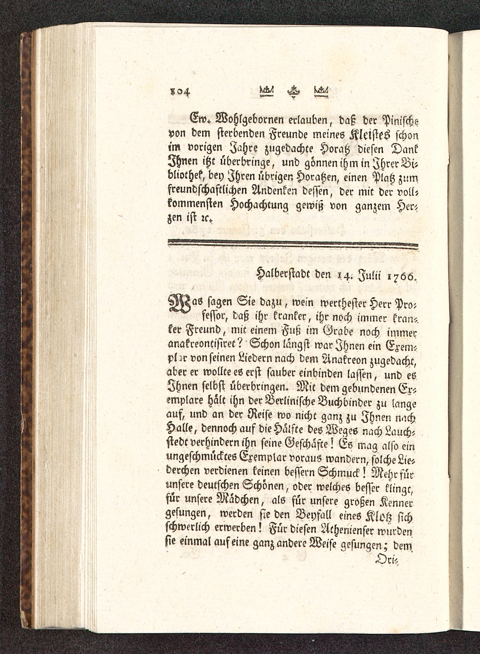 Ew» Wohlgebornen erlauben, daß der Pinischövon dem sterbenden Freunde meines Kleistes schonim vorigen Jahre zugedachte Horatz diesen DankIhnen ihc überbringe, und gönnen ihm in Ihrer Bi-bliothek, bey Ihren übrigen Horatzen, einen Platz zumfreundschaftlichen Andenken dessen, der mit der roll,kommensten Hochachtung gewiß von ganzem Her-zen ist:c.