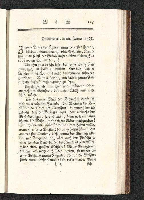 Für das neue Stück der Bibliothek danke ichmeinem werthesten Freunde, dem Verfasser der Kri-tik über die Lieder der Deutschen! Nimmer hätte ichgedacht, daß der Verbesserungen, oder vielmehr derVeränderungen, so viel waren; dann noch nie nahmich mir die Mühe, meine eigene Lieder nachzusehen!«eil-ich sie einmal nicht für meine Lieder halten wollte,wenn ein anderer Verstand daran geholfen hätte ? Einanderes sind Kritiken, diese nimmc der Virtuose seib-sten mit Vergnügen an, aber auch den Pinselstricheiner fremden Hand duldet der Kenner in keinemGe-malde eines grossen Meisters? Meine Kleinigkeitendurften noch wohl entheiliget werden, sie waren dieersten Versuche meiner Jugend , aber an die Meistersstücke eines Naphael mußte kein verbessernder Pinsel