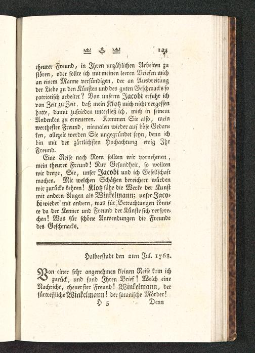 Eine Reise nach Rom sollten wir vornehmen,mein theurer Freund! Nur Gesundheit, so welltenwir dreye, Sie, unser Jgcobt und ich Gesellschaftmachen. Mit welchen Schahen bereichert würdenwir zurücke kehren! Klotz sähe die Werke der Kunstmit andern Augen als WinkelMMM; unser Iac»-bi wieder'mit andcrn, was für Betrachtungen könn-te da der Kenner und Freund der Künste sich verspre-chen! Wa6 für schöne Anwendungen die Freundedes Geschmacks.