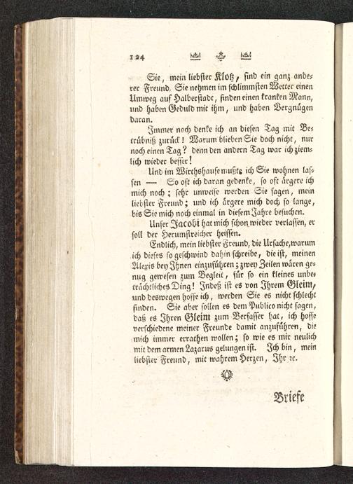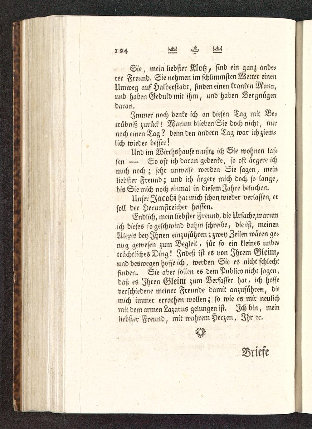 Endlich, mein liebster H-reund, die Ursache,warumich dieses so geschwind dahin schreibe, die ist, meinenAlexis bey Ihnen einzuführen; zwey Zeilen waren ge-nug gewesen zum Begleit, für so ein kleines unbc,crachtlichesDing! Indeß ist es von Ihrem GletM/und deswegen hoffe ich, werden Sie es nicht schlechtfinden. Sie aber sollen es dem Publico nicht sagen,daß es Ihren GletM zum Verfasser hat, ich hoffeverschiedene meiner Freunde damit anzuführen, diemich immer errathen wollen; so wie es mir neulichmit dem armen Lazarus gelungen ist. Ich bin, meinliebster Freund, mit wahrem Herzen, Ihr ?c.