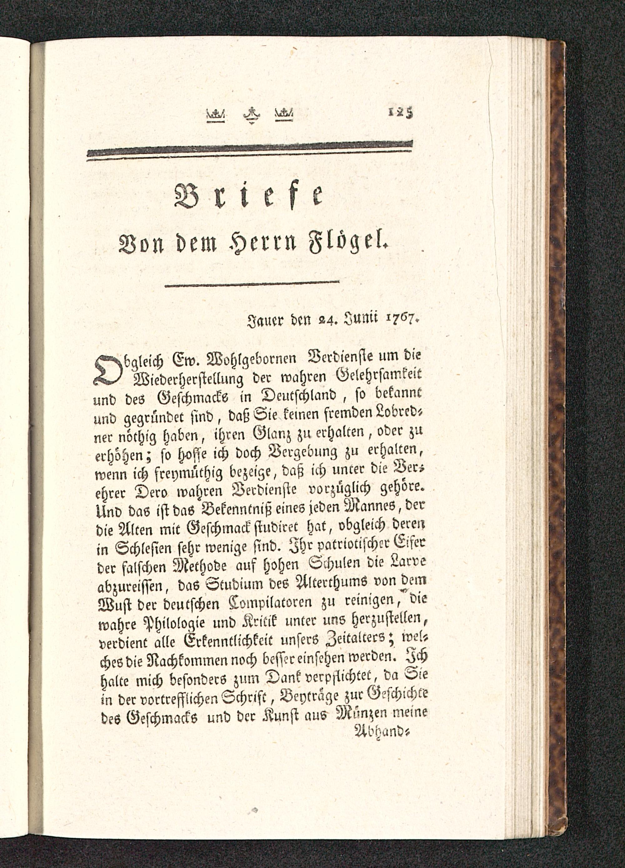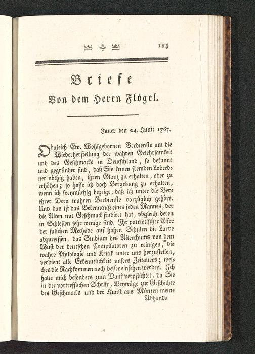 bgleich Ew. Wohlgebornen Verdienste um dieWiederherstellung der wahren Gelehrsamkeitund des Geschmacks in Deutschland , so bekanntund gegründet sind , daß Sie keinen fremden Lobrcd-ner nöthig haben, ihren Glanz zu erhalten, oder zuerhöhen; so hoffe ich doch Vergebung zu erhalten,wenn ich freymüthig bezeige, daß ich uncer die Ver;ehrer Dero wahren Verdienste vorzüglich gehöre.Und das ist das Bekenntniß eines jeden Mannes, derdie Alten mit Geschmack studiret hat, obgleich derei,in Schlesien sehr wenige sind. Ihr patriotischer Eiferder falschen Methode auf hohen Schulen die Larveabzureißen, das Studium des Alterthums von demWust der deutschen Compilatorcn zu reinigen,"diewahre Philologie und Kritik unter uns herzustellen,verdient alle Erkenntlichkeit unsers Zeitalters; weischeS die Nachkommen noch besser einsehen werden. Ichhalte mich besonders zum Dank verpachtet, da Siein der vortrefflichen Schrift, Beytrage zur Geschichtedes Geschmacks und der Kunst aus Münzen meine