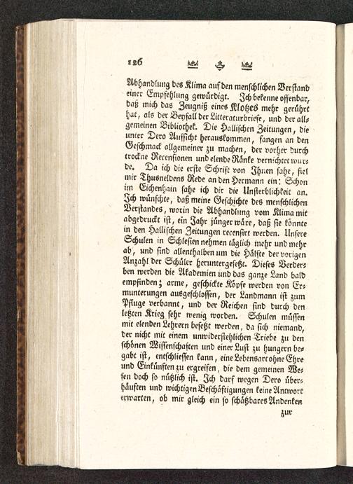 Abhandlung des Klima aufden menschlichen Verstandeiner Empfehlung gewürdigt. Ich bekenne offenbar,daß mich das Zeugniß eines Klotzes mehr gerührthat, als der Keysall der Litteraturbriefe, und der all-gemeinen Bibliothek. Die Hallischen Zeitungen, dieunter Dero Aufsicht herauskommen, fangen an denGeschmack allgemeiner zu machen, der vorher durchtrockne Recensionen und elende Ranke vernichtet wur-de. Da ich die erste Schrift von Ihnen sahe, fielmir ThuSneldenS Rede an den Hermann ein: Schonim Eichenhain sahe ich dir die Unsterblichkeit an.Ich wünschte, daß meine Geschichte des menschlichenVerstandes, worin die Abhandlung vom Klima mitabgedruckt ist, ein Jahr jünger wäre, daß sie könntein den Hallischen Zeitungen recensirt werden. UnsereSchulen in Schlesien nehmen taglich mehr und mehrab, und sind allenthalben um die Halste der vorigenAnzahl der Schüler heruntergesetzt. Dieses Verder;den werden die Akademien und das ganze Land baldempfinden; arme, geschickte Köpfe werden von Er;munterungen auegeschlossen, der Landmann ist zumPfluge verbannt, und der Reichen sind durch denletzten Krieg sehr wenig worden. Schulen müssenmit elenden Lehrern besetzt werden, da sich niemand,der nicht mit einem unwiderstehlichen Triebe zu denschönen Wisienschaften und einer Lust zu hungern be-gabt ist, entschliessen kann, eine Lebensart ohne Ehreund Einkünften zu ergreifen, die dem gemeinen We-sen doch so nützlich ist. Ich darf wegen Dero über-häuften und wichtigen Beschäftigungen keine Antworterwarten, ob mir gleich ein so schätzbares Andenken