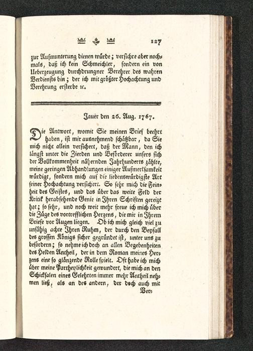 <^>e Antwort, womit Sie meinen Brief beehrthoben, ist mir auenehmend schaßbar , da Siemich nicht allein versichert, daß der Mann, den ichlängst unter die Zierden und Beförderer unsere sichder Vollkommenheit nähernden Jahrhunderts zahlte,meine geringen Abhandlungen einiger Aufmerksamkeitwürdigt, sondern mich aus die liebenswürdigste Artseiner Hochachtung versichert. So sehr mich die Fein»heit des Geistes, und das über das weite Feld derKritik herabsehende Genie in Ihren Schriften gereizthat; sosehr, und noch weit mehr freue ich mich überdie Züge des vortrefflichen Herzens, die mir in IhremBriefe vor Augen liegen. Ob ich mich gleich viel zuunfähig achte Ihren Ruhm, der durch den Beyfalldes grossen Königs sicher gegründet ist, unter uns zubefördern; so nehme ich doch an allen Begebenheitendes Helden Antheil, der in dem Roman meines Her»zenS eine so glänzende Rolle spielt. Oft habe ich michüber meine Parteylichkeit gewundert, die mich an denSchicksalen eines Gelehrten immer mehr Antheil neh»men ließ, als an des andern, der dsch auch mit