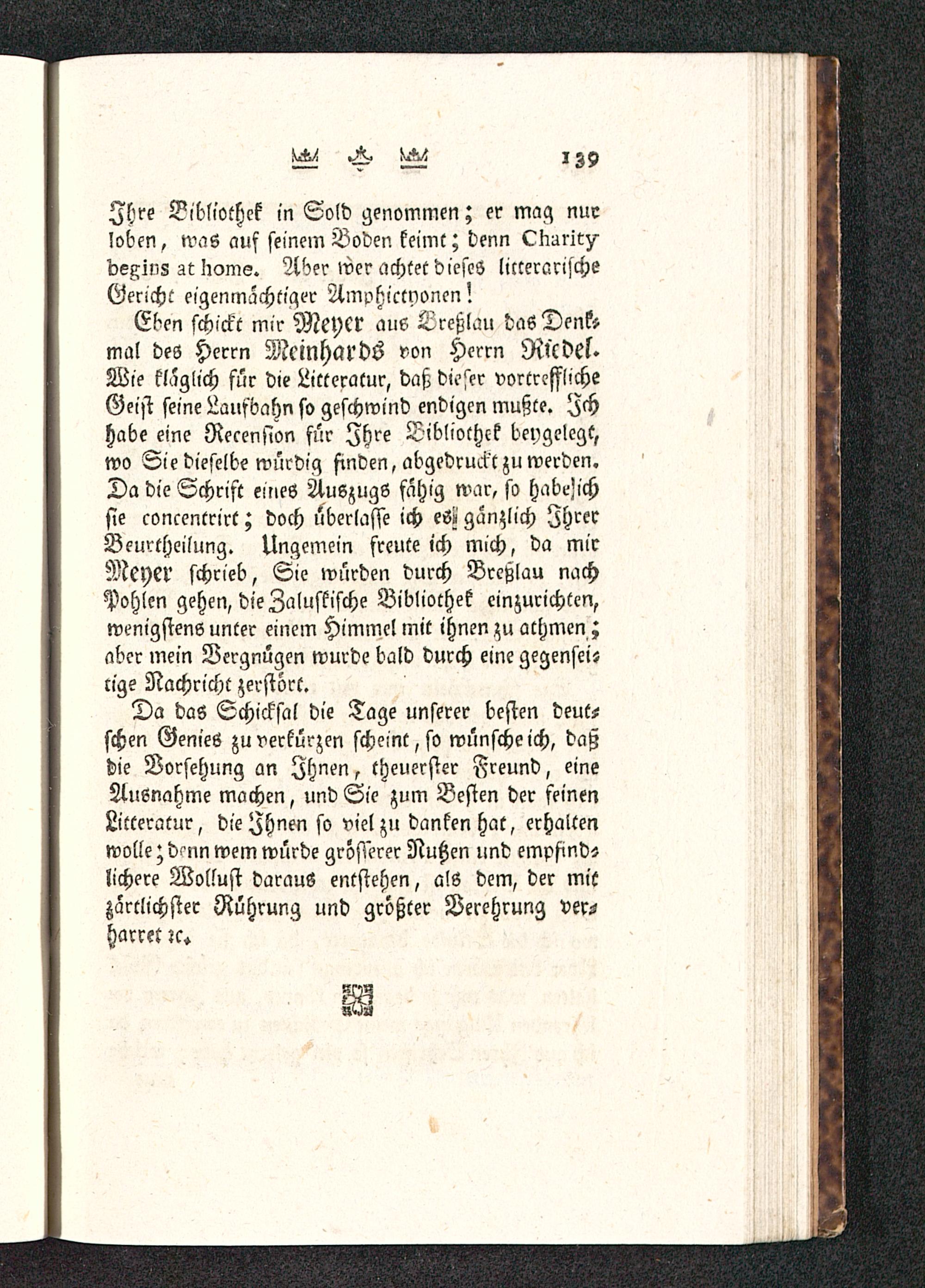 Eben schickt mir Meyer aus Lreßlau dasDenk»mal des Herrn Meinhards ron Herrn Rltdel.Wie kläglich für die Litteratur, daß dieser vortrefflicheGeist seine Laufbahn so geschwind endigen mußte. Ichhabe eine Recension für Ihre Bibliothek bellgelegt,wo Sie dieselbe würdig finden, abgedruckt zu werden.Da die Schrift eines Auszugs fähig war, so habeZichsie concentrirt; doch überlasse ich eÄ ganzlich IhrerBeurtheilung. Ungemein freute ich mich, da mirMeyer schrieb, Sie würden durch Brcßlau nachPohlen gehen, die Zaristische Bibliothek einzurichten,wenigstens unter einem Himmel mit ihnen zu athmen ;aber mein Vergnügen wurde bald durch eine gegensei-tige Nachricht zerstört.