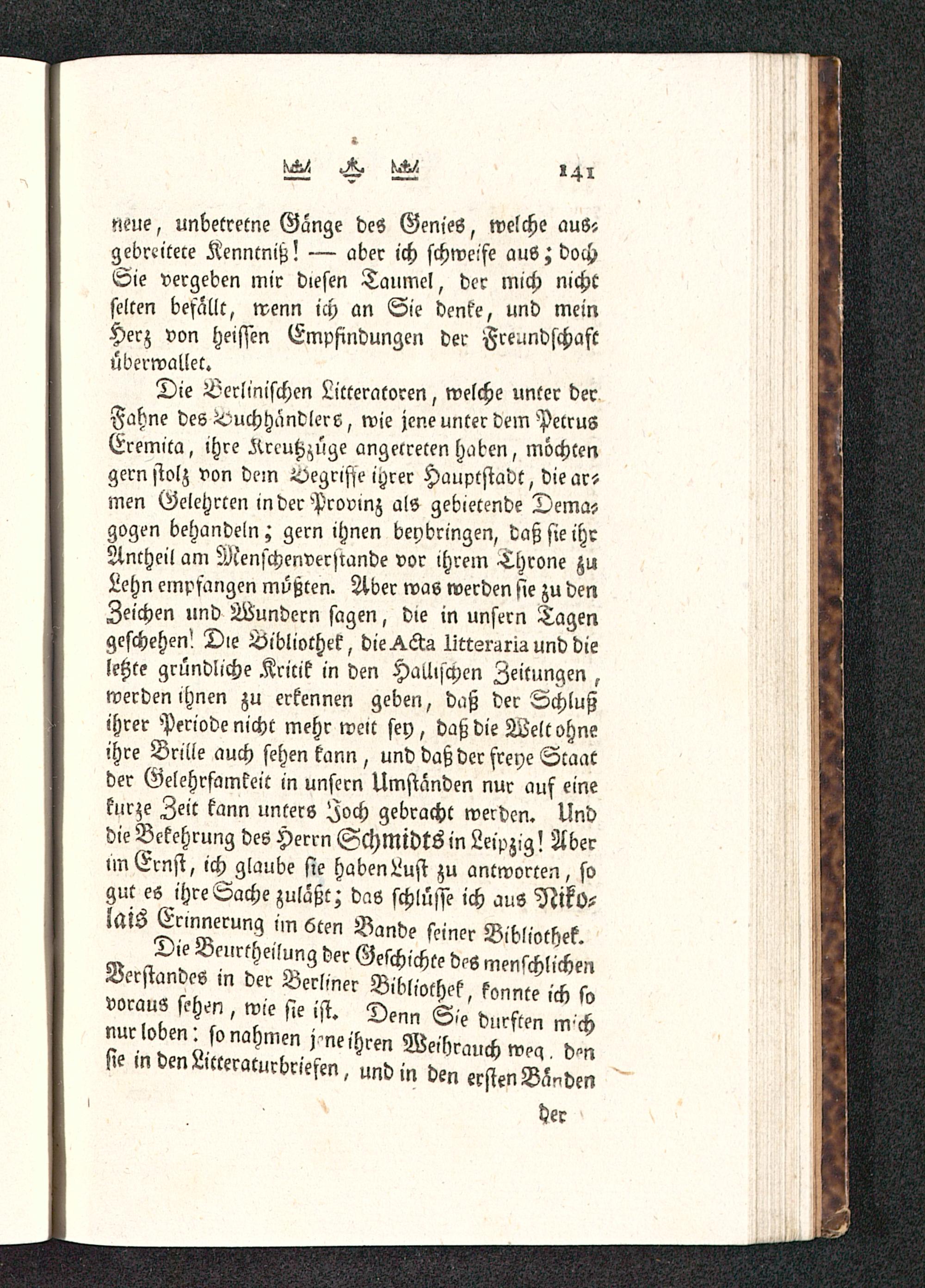Die Berlinischen Litteratoren , welche unter derFahne des Buchhändlers, wie jene unter dem PetrusEremita, ihre Äreutz^üge angetreten haben, möchtengern stolz von dem wegrisse igrer Hauptstadt, die arsmen Gelehrten in der Provinz als gebietende Dema»zogen behandeln; gern ihnen beybringen, daß sie ihrAntheil am Menschenverstände vor ihrem Throne zuLehn empfangen müßten. Aber was werden sie zu denZeichen und Wundern sagen, die in unsern Tagengeschehen' Die Bibliothek, die^-Äa littsruria und dieletzte gründliche Kritik in den Hallischen Zeitungen ,werden ihnen zu erkennen geben, daß der Schlußihrer Periode nicht mehr weit sey, daß die Welt ohneihre Brille auch sehen kann , und daß der freye Staatder Gelehrsamkeit in unsern Umstanden nur auf einekurze Zeit kann untere Joch gebracht werden. Unddie Bekehrung des Herrn Schmidts in Leipzig ! Aberim Ernst, ich glaube sie haben Lust zu antworten, sogut es ihre Sache zulaßt; das schlüge ich aus Niko-lais Erinnerung im Seen Bande seiner Bibliothek.
