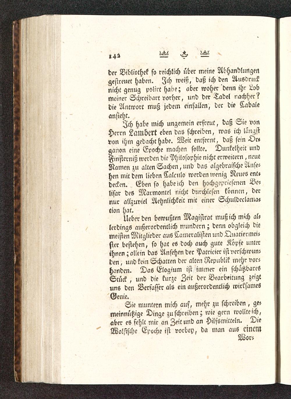 Ich habe mich ungsmcin erfreut, daß Sie vonHerrn LüMbert eben das schreiben, waö ich langstvon ihm gedacht habe. Weit entfernt, daß sein >Or»ganon eine Epoche machen sollte. Dunkelheit undFinsterniß werden die Philosophie nicht erweitern , neueNamen zu alten Sachen, und das algebraische Anse-hen mit dem lieben Calculo werden wenig Neues ent»decken. Ebenso habeich den hochgspriesencn Be-llsar des Marmontel nicht durchlesen können, dernur allzuviel Ähnlichkeit mit einer Schuldeclamastion hat.