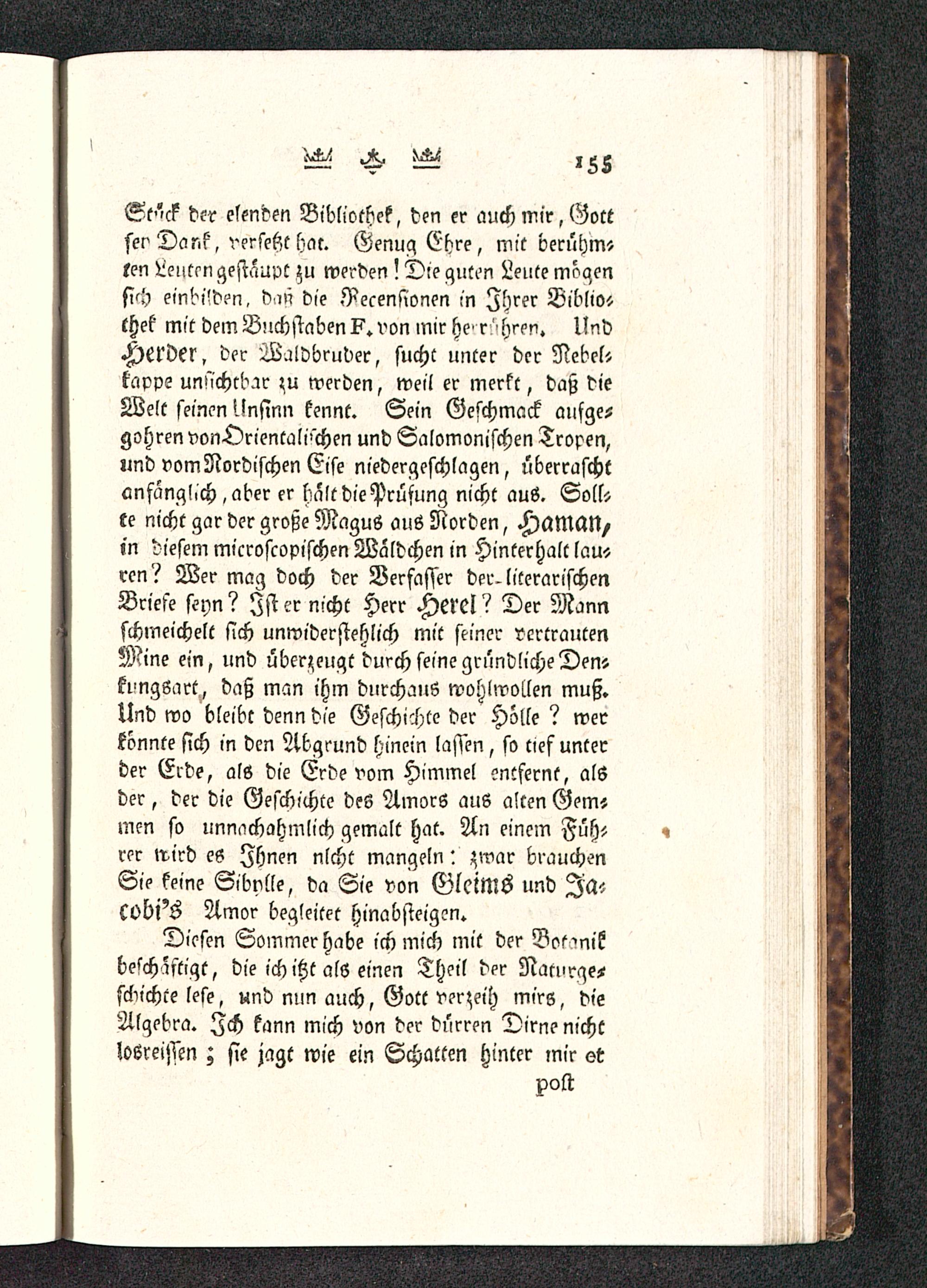 St'-ck der elenden Bibliothek, den er auch mir, Gottsei" Dank, verseßt hat. Genug Ehre, mit berühm»ten ^eüttn gestäupt zu werden ? Die guten Leute mögensich einbilden, daß die Recensionen in Ihrer Biblio-thek mit dem Buchstaben?, von mir he r ühren. UndHerder, der Waldbruder, sucht unter der Nebelttappe unsichtbar zu werden, weil er merkt, daß dieWelt seinen >.!nsinn kennt. Sein Geschmack aufge-gohrenvonDrientali'chen und Salomonischen Tropen,>md vom Nordischen Eise niedergeschlagen, überraschtanfanglich,aber er haltdiePrüsung nicht aus. Solltte nicht gar der große MaguS aus Norden, HaMttN/in diesem microscopischen Waldchen in Hinterhalt lau»rcn? Wer mag doch der Verfasser der. literarischenBriefe seyn? Ist er nicht Herr Herel? Der Mannschmeichelt sich unwiderstehlich mit seiner vertrautenMine ein, und überzeugt durch seine gründliche Den-kungsart, daß man ihm durchaus wohlwollen muß.Und wo bleibt denn die Geschichte der Holle ? werkönnte sich in den Abgrund hinein lassen, so tief unterder Ecde, als die Erde vom Himmel entfernt, alsder, der die Geschichte des AmorS aus alten Gern«mm so unnachahmlich gemalt hat. An einem Füh-rer wird es Ihnen nlcht mangeln: zwar brauchenSie keine Sibvlle, da Sie von GlelMs und Ja«cobi's Amor begleitet hinabsteigen.