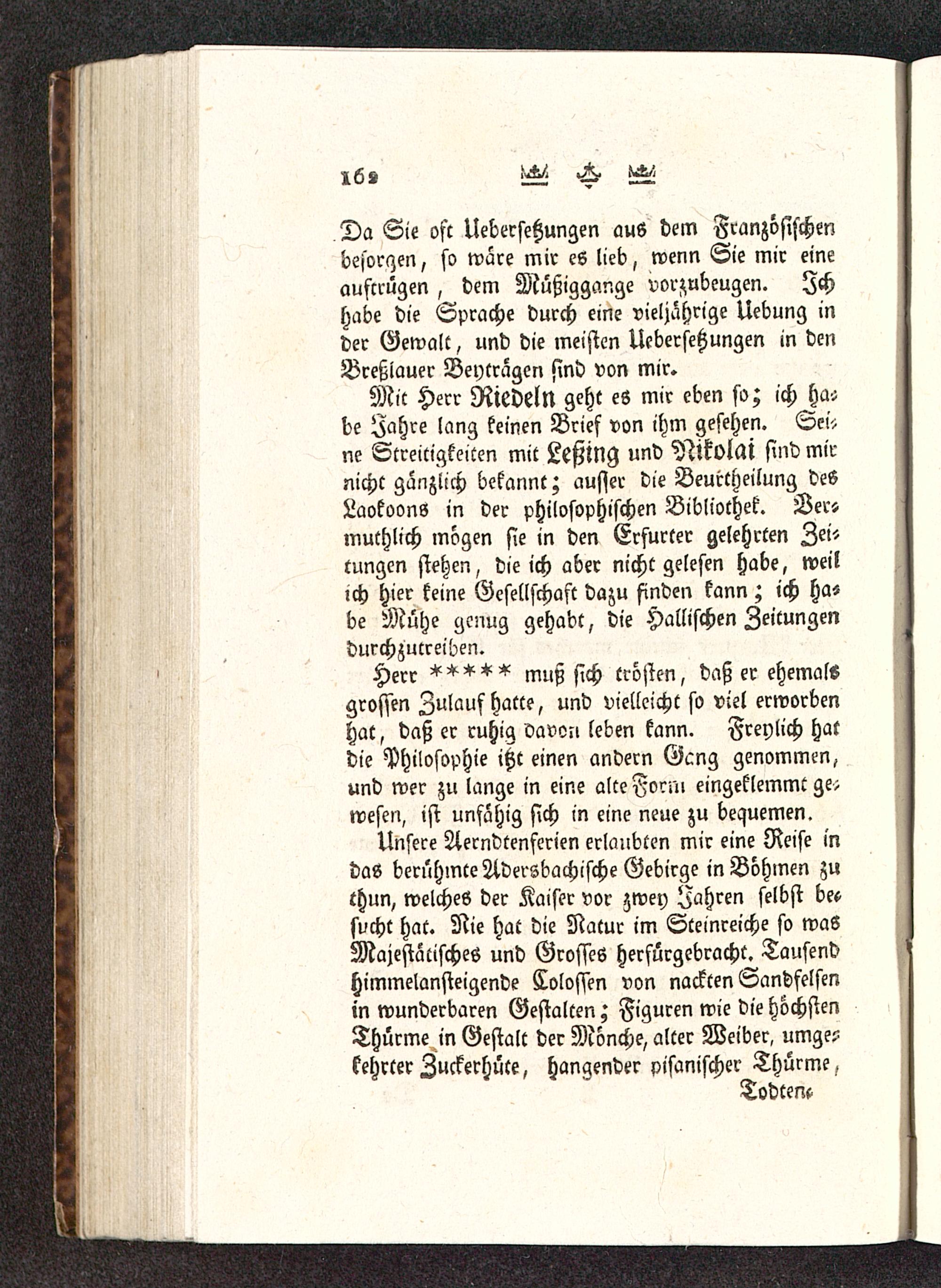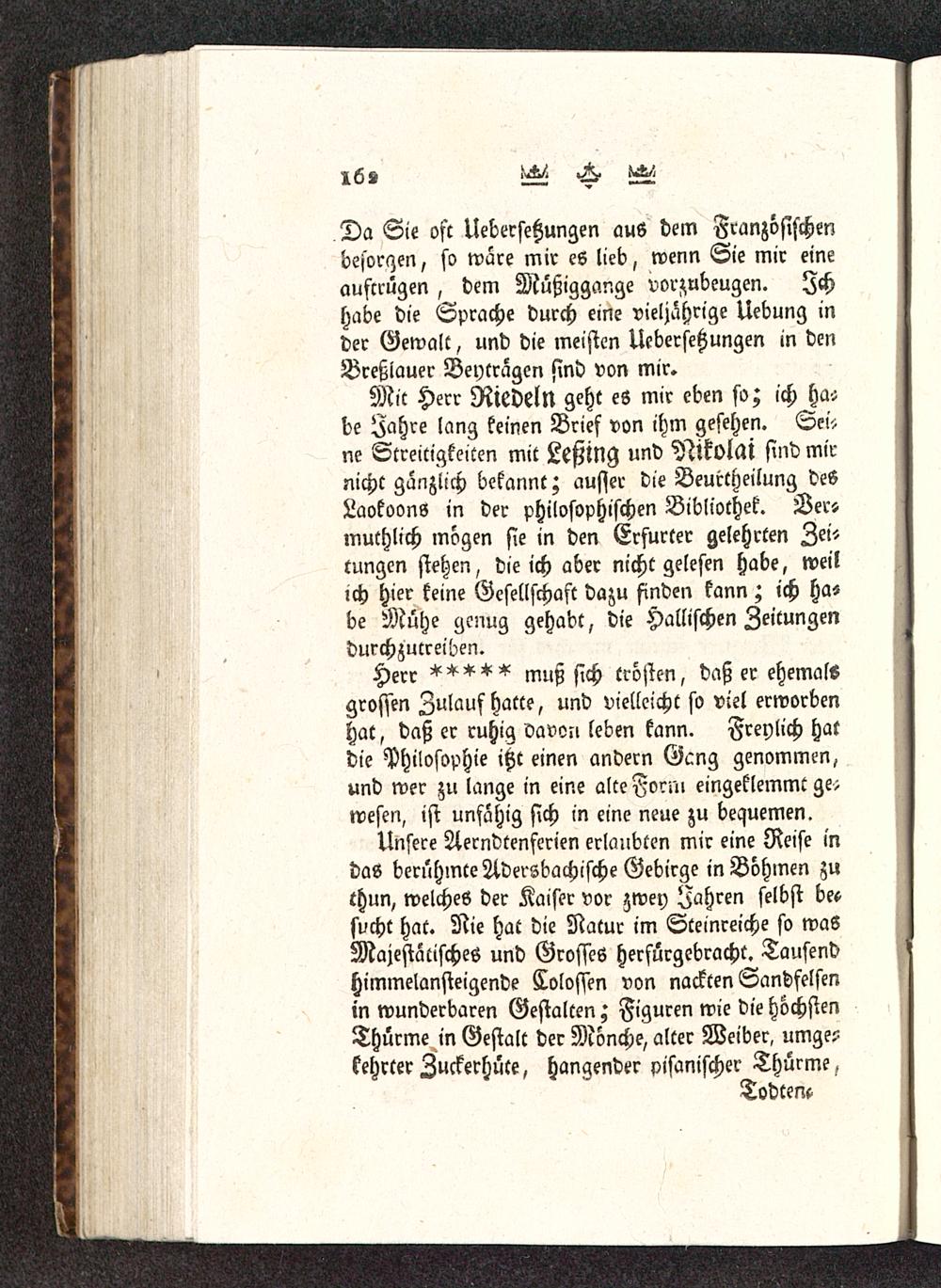 Da Sie oft Uebersetzungen aus dem Französischenbesorgen, so wäre mir es lieb, wenn Sie mir eineauftrügen, dem Müßiggange vorzubeugen. Ichhabe die Sprache durch eine vieljahrige Uebung inder Gewalt, und die meisten Ucberseßungen in denBreßlauer Beytragen find von mir.