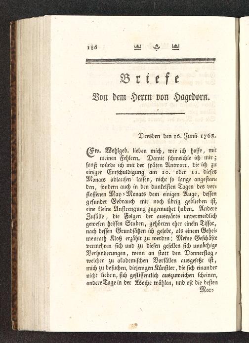 Mw. Wohlgeb. lieben mich, wie ich hoffe, mit^ meinen Fehlern. Damit schmeichle ich mir;sonst würde ich mit der spaten Antwort, die ich zueiniger Entschuldigung am lo. oder ll. diesesMonatS ablausen lassen, nicht so lange angestautden, sondern auch in den dunkelsten Tagen de6 ver-flossenen May »Monatö dem einigen Äuge, dessengesunder Gebrauch mir noch übrig geblieben ist,eine kleine Anstrengung zugemuthet haben. AndereZufälle, die Folgen der auöwartS unvermeidlichgewesen heissen Stuben, gehörten eher einem Tissot ,nach dessen Grundsaßen ich gelebt, als einem Geheismenrath Klotz erzählt zu werd?n: Meine Geschäftevermehren sich und zu diesen gesellen sich unnöthigeVerhinderungen, wenn an statt den Donnerstag,welcher zu akademischen Vorfallen ausgesetzt ist,mich zu besuchen, diejenigen Künstler, die sich einandernicht lieben, sich geflissentlich auszuweichen scheinen,andere Tage in der Woche wählen, und oft die besten