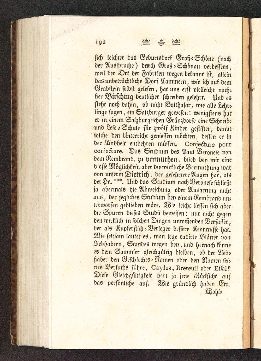 sich leichter daß Geburtsdorf Groß«Schöne (nachder Aussprache) dl»ch Groß-Schönau verbessern,weil der Ort der Fabriken wegen bekannt ist, alleindas unbeträchtliche Dorf Cammcrn, wie ich auf demGrabstein selbst gelesen, hat uns erst vielleicht nach-her BÜschlNq deutlicher schreiben gelehrt, Und eSsteht noch dahin, ob nicht Balthasar, wie alle Lehr»linge sagen, ein Salzburger gewesen: wenigstens hater in einem Salzburg schen Granzdorfe eine Schreib-und Lese - Schule für zwölf Kinder gestiftet, damitsolche den Unterricht gemessen mochten, dessen er inder Kindheit entbehren müssen. LonjeÄurs xour(.'onisÄurs. DaS Studium des Paul Veronei'e vondem Rembrand, zu vermuthen, blieb den mir ein?blosse Möglichkeit, aber die wirkliche Vermuthung warvon unserm Dietrich , der gelehrtere Augen hat, alsder Hr. Und das Studium nach Veronese schließtja abermals die Abweichung oder Ausartung nichtmiS, der jegliches Studium bey einem Rembrand un-terworfen geblieben wäre. W'? leicht liessen sich aberdie Spuren dieses Studii beweisen: nur mcht gegenden wirklich in solchen Dingen unmißenden Verfasser,der als Kupferstiche Verleger bessere Kenntnisse hat.Wie seltsam lalltet e6, man lege radirte Blätter vonLiebhabern, Standes wegen den, und hernach könnees dem Sammler gleichgültig bleiben, ob der Lieb»Haber den Geschlechts < Namen oder den Namen sp>-nes Versuchs f'-bre, Ls^Ius, Z?re^eui1 oder Lsszj?Diese Gleichgültigkeit be! t ja jene Rücksicht aufdas persönliche aus. Wie gründlich haben Ew.