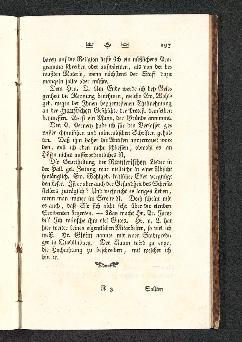 Die Beurtheilung der RamlerischM Lieder inder Hall. gel. Zeitung war vielleicht in einer Absichchinlänglich. Ew. Wohlgeb. kritischer Eifer vergnügtden Leser. Ist er aber auch der Gesundheit des Schrift»siellerö zuträglich? Und verspricht es langes Leben,wenn man immer im Streite ist. Doch scheint mires auch, daß Sie sich nicht sehr über die elendenScribenten ärgerten. Was macht Hr. Pr. Faco-bi? Ich wünsche ihm viel Gutes. Hr. v. L. hathier weiter keinen eigentlichen Mitarbeiter, so viel ichweiß. Hr. GleitN nannte mir einen Stadtprcdi-ger in Quedlinburg . Der Raum wird zu enge,die Hochachtung zu beschreiben, mit welcher ichhin :c,°