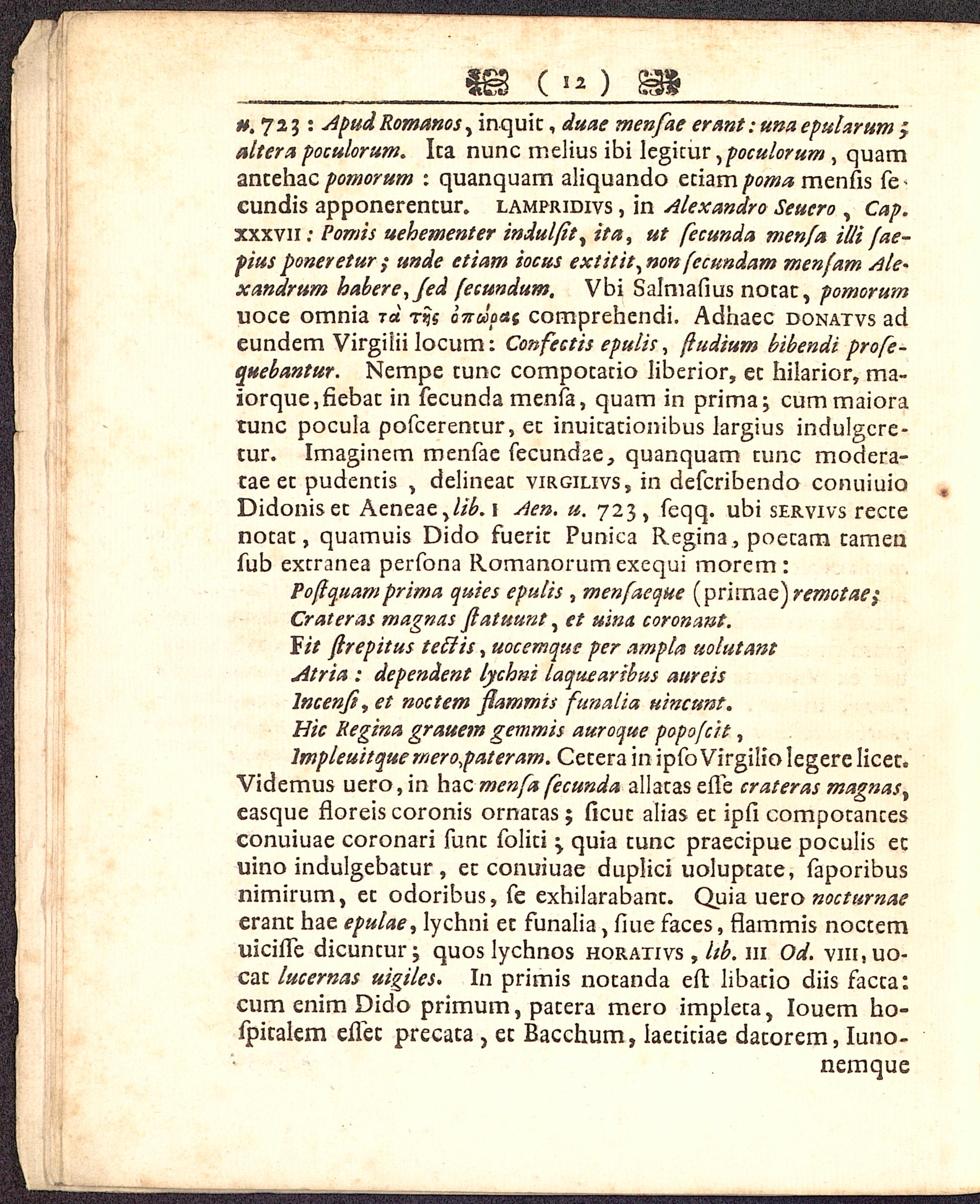 u. 723 : ApudRomanos^ inquic, duae menfae erant: una epulxrum £altera poculorum. Ica nunc melius ibi legicur ^poculorum , quamancehac pomorum : quanquam aliquando eciam poma menfis fe-cundis apponerencur. lampridivs , in Alexandro Seucro , Cap.xxxvii: Pomis uehementer indulftt^ ita, ut fecunda menfa illi fae-fius poneretur ; unde etiam iocus extitit,non fecundam menfam Ale*xandrum habere,fed (ecundum. Vbi Salmafius nocac, pomorumuoce omnia jd r*is onwaen comprehendi. Adhaec donatvs adeundem Virgiiii locum: Confectis epulis , (ludium bibendi profe-quebantur. Nempe cunc compocacio Hberior, ec hilarior, ma-iorque,fiebac in fecunda menfa, quam in prima; cummaioratunc pocula pofcerencur, ec inuicacionibus largius indulgcre-cur. Imaginem menfae fecundae, quanquam cunc modera-cae ec pudencis , delineac virgilivs, in defcribendo conuiuioDidonisec Aeneae,//£. 1 Aen. u. 723, feqq. ubi servivs reccenocac, quamuis Dido fueric Punica Regina, poecam cameufub excranea perfona Romanorum exequi morem: