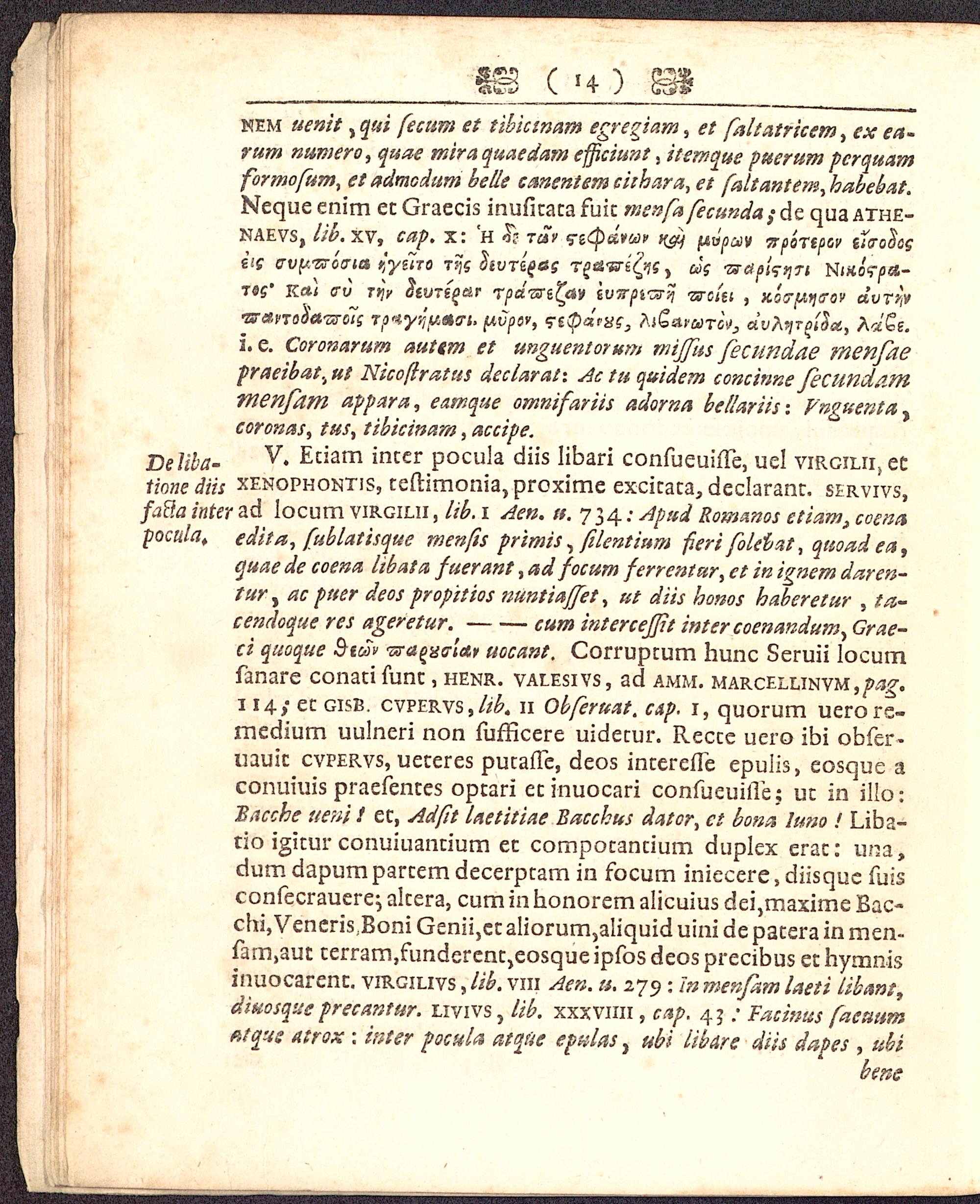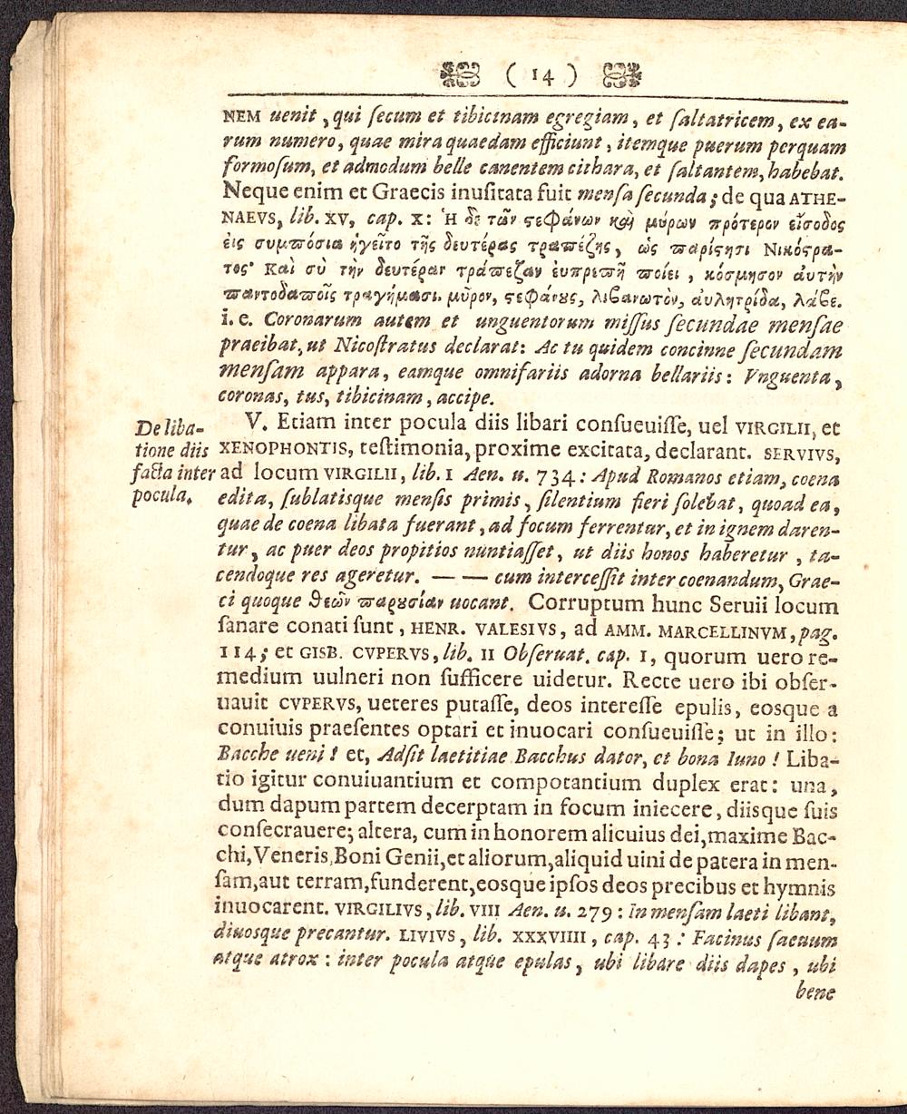 nem uenit ^qui fecum et tibicmam egregiam, et faltatricem, cx ea-rum numero, quae miraquaedam efficiunt , itemcjue puerum pcrquamformofum, et admodum helle canentem ciihara, et faltantem, habebat.Neque enim ec Graecis inuficacafuic msnfa fecunda;dc qua athe-NAEVS, lib. xv, cap. x: *H 5? raV <?t<pd*'jOi> k& [topav TtfoTtpov tlcroocsit( avy.Tzrocria ^yiiro t?]s hvTtges Tg&iriQis , o$s ■z^dpt^^Ti NitfoV/m-t«5* Kct) <rv lYiy StvTtcictr T/iaVj^»» tvrrpi-zrvi ^zolti , K07pir]crov dvTWinano^ttnjjols rp f iyr,y»crt, (Avpov, ^tt&deiss, 7\iQ&ra>Tc\, dvAfiroiclec., A#'£g.I. e. Coronarum autgm et unguentormn miffus fecundae menfaefraeibat. t ut Nicoftratus declarat: Ac tu quidem concinne fecunolamtnenfam appara, eamque omnifariis adorna bellariis: Fnguenta yeoronas, tus, tibicinam, accipe.DeUba- Y* i nccr pocula diis Iibari confueuuTe, uel viRciLi^ec