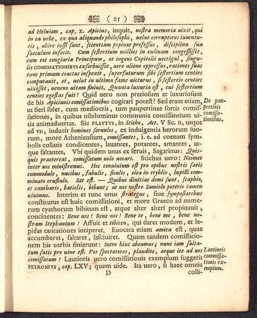 ad Helaiam 3 cap. x. Apicius, inquic, noftra memoria uixit ,quiin ea urbe , ex qua aliquando philofophi , uelut corrttptores iuttentu-tis y abire iujji funt , fcienttam popinse profejfus , difciplina fuafaeculum infecit. Cum feflertium millies in culinam congejjijjet ,cum tot congiaria Principum } et ingens Capitolii uectigal , (ingu-lis cOMlssATlomBVS exforbuijfet y aere alieno opprefjus % rationes Jttastunc primum coactus infpexit , ftiperfuturum fibi feflertium centiescomputauit, et 3 uelut in ultima fame uicturus , ft feflertio centiesuixijfct , ueneno uitam finiuit, Jgttanta luxuria eft , cui feflertiumcenties egeflas fuit! Quid uero non preciofum ec luxuriofumde his Apicianis comijfationibus cogicari poceft? Sederanceciam,De pauuc fieri folec, cum mediocris , cum paupercinae forcis comif- pertinisfaciones, in quibus nihilominus communia comiffancium ui- c ? m if a "cia animaduercas. Sic plavtvs , in Sticho, Act. V Sc. n, usque wad vii , inducic homines feruulos , ex indulgencia herorum fuo-rum, more Achenienfium, comiffantes, i. e. ad coenam fym-bolis collacis condicences, lauances, pocances, amances, ac-que fakances, Vbi quidem unus ex feruis, Sagarinus: jj)itis-quis praetereat , comijfatum uoio uocari. Sciehus uero: Nosmetinter nos minijlremus. Hoc conniuium efl pro opibus noftris fatiscommodule , nucibus s fabulis , pculis , olea in tryblio , lupillicom-minuto cruflulo. Sat eft. — £htibus diuitiae domi funt , fcaphio,et cantharis, batiolis, bibuntj at nos noftro Samiolo poterio tamenuiuimus. Incerim ec cunc unus ftrategns , fiue fympofiarchusconfticucus eft huic comiffacioni, ec more Graeco ad nume-rum cyachorum bibicum eft, acque alcer alceri propiuauic,concinences: Bene uos ! Bene nos! Bene te , bene me > bene no-flram Stephanium ! Affuic ec tibicen, qui darec modum, ec le-pidas cancaciones inciperec. Euocaca eciam amica eft, quaeaccumberec, falcarec, lafciuirec. Quam candem comiflacio-nem his uerbis finierunc: Intro hinc abeamus ; nunc iam falta-tum fatis pro uino efi. Vos fpectatores, plaudite, atque ite ad uos Lantioriscomiffatum ! Laucioris uero comifiacionis exemplum fuggeric C0W7 ^ ? J?^"petroniys , cap. LXVj quem uide. Ica uero , fi haec omnia t^^ff"