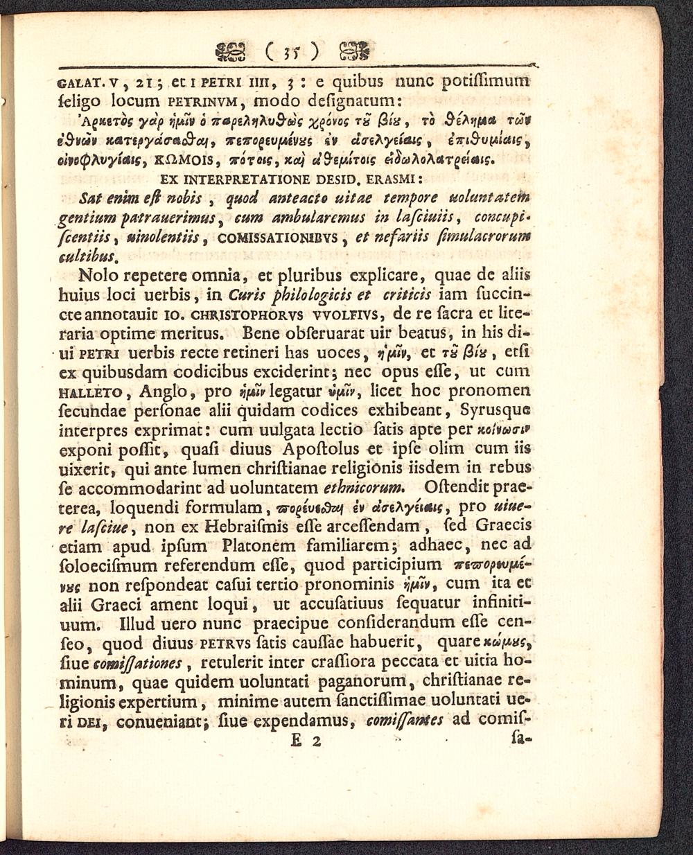 Nolo repecere omnia, ec pluribus explicare, quae de aliishuius loci uerbis, in Curis pbilologicis et criticis iam fuccin-cceannocauic 10. christophorvs vvolfivs, de re facra ec lice-raria opcime mericus. Bene obferuarac uir beacus, in his di-ui petri uerbis recce recineri has uoces, tjfXiv, ec rS 02 , ecfiex quibusdam codicibus exciderinc; nec opus efle, uc cumhalleto, Anglo, pro jjf»7c Iegacur vuly, Iicec hoc pronomenfecundae perfonae alii quidam codices exhibeanc, Syrusqueincerpres exprimac: cum uulgaca leccio facis apce per Kolwa-t*exponi pollk, quafi diuus Apoftolus et ipfe olim cum iisuixcric, qui ance Iumen chriftianae religionis iisdem in rebusfe accommodarinc ad uoluncacem ethnicorum. Oftendic prae-terea, Ioquendi formulam, tso%tu%&u\ h do-e\yu*ig, pro uiue-re lafciue, non ex Hebraifmis elTe arceflendam , fed Graeciseciam apud ipfum Placonem familiarem; adhaec, nec adfoloecifmum referendum efle, quod parcicipium -xvzsopvoyki-vxg non refpondeac cafui tercio pronominis y(*7v, cum ica ecalii Graeci amenc loqui, uc accufaciuus fequacur infinici-uum. Illud uero nunc praecipue confiderandum efle cen-feo, quod diuus petrvs facis cauflae habueric, quare x«7*y?,fme eomtffationes , reculeric incer crafliora peccaca ec uicia ho-minum, quae quidem uoluncaci paganorum, chriftianae re-ligionis expertium, minime aucem fancciflimae uoluncaci ue-riDEi, conuenianti fiue expendamus, comiffantes ad comif-