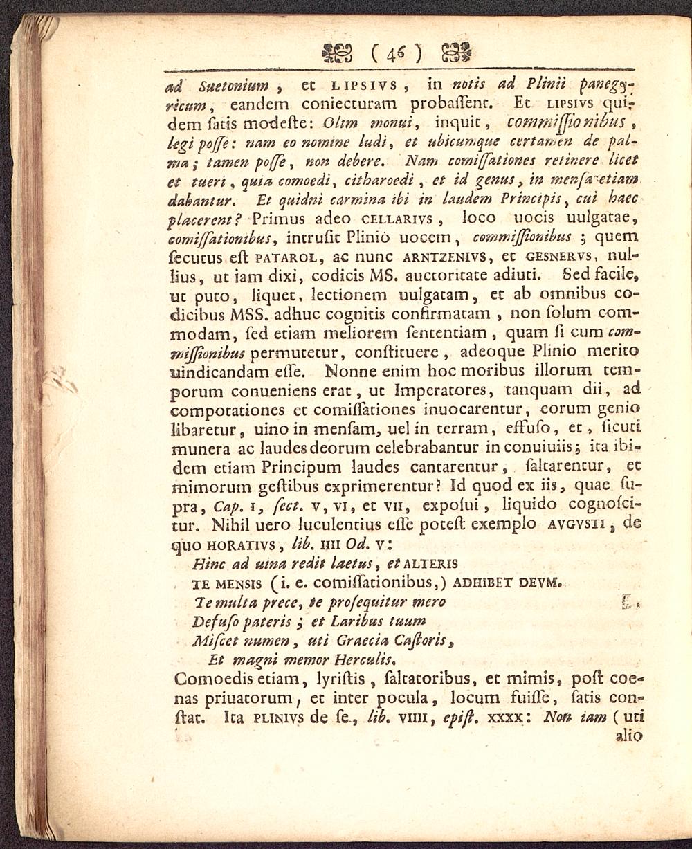 lius, utiamdixi, codicis MS. aucconcace adiuti. Sed facile,uc puco, liquec, lectionem uulgatam, ec ab omnibus co-dicibus MSS. adhuc cognitis confirmatam , non folum com-modam, fed etiam meliorem fententiam , quam fi cum com-mijfionibus permutetur, confricuere , adeoque Plinio mericouindicandam efle. Nonne enim hoc moribus illorum cem-porum conueniens erac, uc Imperacores, tanquam dii, ad.compotationes ec comiflaciones inuocarentur, eorum geniolibaretur, uino in menfam, uel in terram, effufo, ec, iicucimunera ac laudesdeorum celebrabancur inconuiuiis; ica lbi-dem etiam Principum laudes cancarencur, faltarentur, ecmimorum geftibus cxprirnerencur? Id quod ex iis, quae fu-pra, Cap. i } fect. v, vi, ec vn, expolui, liquido cognofci-tur. Nihil uero luculentius efle poceft exemplo avgvsti , dequo horativs , lib. hii Od. v: