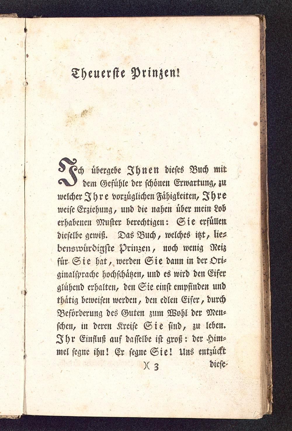 übergebe Ihnen dieses Buch mit*0 dem Gefühle der schönen Erwartung, zuwelcher Ihre vorzüglichen Fähigkeiten, Ihreweise Erziehung, und die nahen über mein Loberhabenen Muster berechtigen: Sie erfüllendieselbe gewiß. Das Buch, welches itzt, \kabenswurdigsie Prinzen, noch wenig Reizfür- S i e hat, werden S i e dann in der Ori-ginalsprache hochschätzen, und es wird den Eiferglühend erhalten, den Sie einst empfinden undthatig beweisen werden, den edlen Eifer, durchBeförderung des Guten zum Wohl der Men-schen, in deren Kreise Sie sind, zu leben.Ihr Einfluß auf dasselbe ist groß: der Him-mel segne ihn! Er segne Sie! Uns entzückt