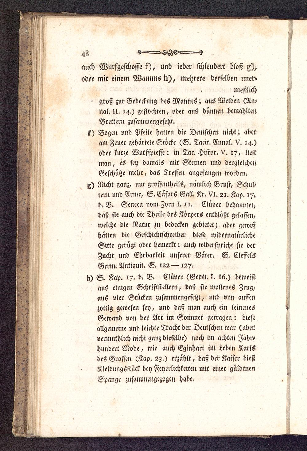 g) Nicht ganz, nur grossenthcils, nämlich Brust, Schuftlern und Arme, S. Cäsars Gall. Kr. Vh 21. Kap. 17*d» B. Scneca vom Zorn 1.11. Clüver behauptet/daß sie auch die Theile des Körpers entblößt gelassen,»velche die Natur zu bedecken gebietet; aber gewißhatten die Geschichtschreiber diese widernatürlicheSitte gerügt oder bemerkt: auch widerspricht sie derZucht und Ehrbarkeit unserer Vater. S. CleffelSGcrm. Antiquit. S. 122 —127.