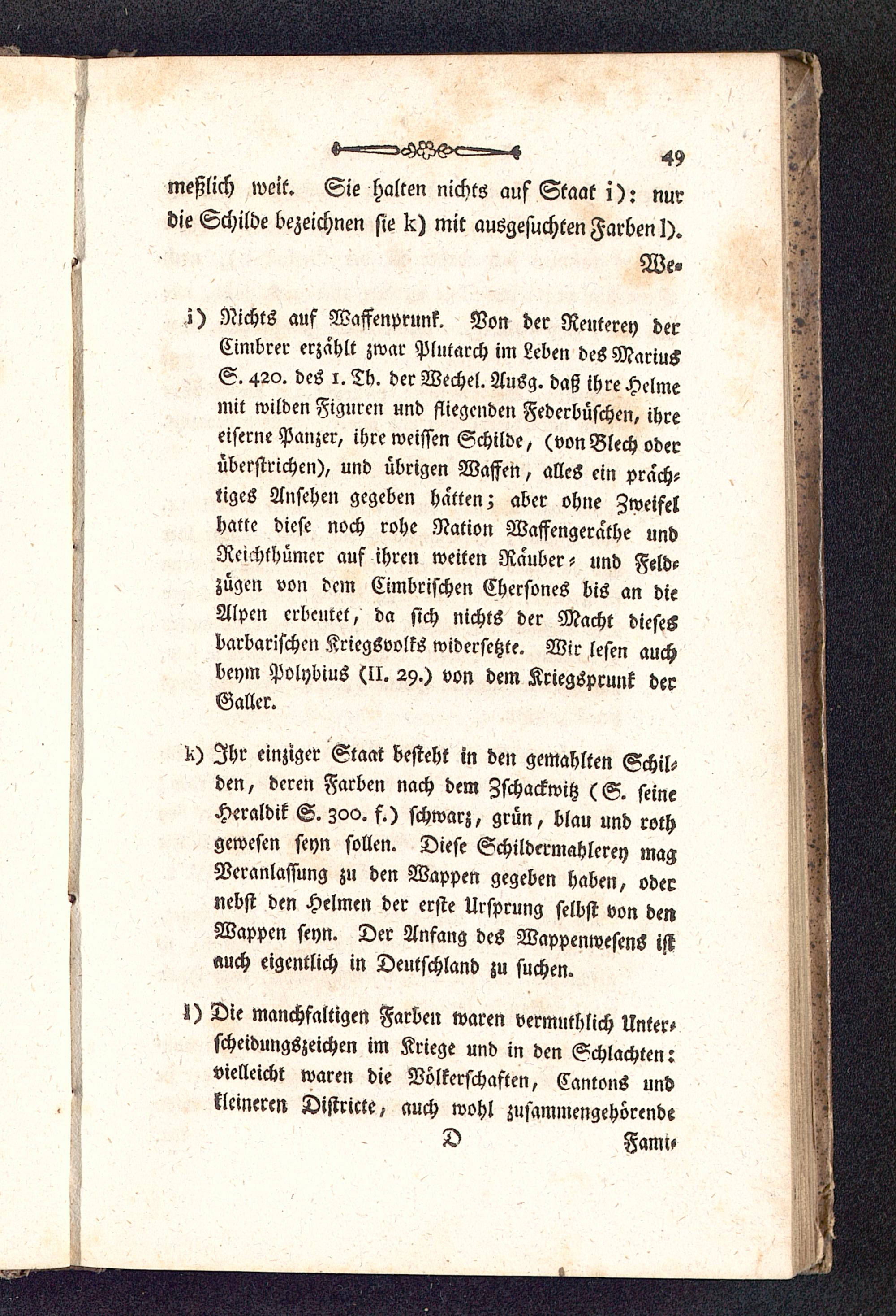 i) Nichts auf Waffenprunk. Von der Reuterey derCimbver erzahlt zwar Plutarch im Leben des MariuSS. 420. des l. Tb. der Wechel. Ausg. daß ihre Helmemit wilden Figuren und fliegenden Federbüschen, ihreeiserne Panzer, ihre weissen Schilde, (von Blech oderüberstrichen), und übrigen Waffen, alles ein prach-tiges Ansehen gegeben hatten; aber ohne Zweifelhatte diese noch rohe Nation Waffengerathe undReichthümer auf ihren weiten Rauber- und Feld-zügen von dem Cimbrischen Chersones bis an dieAlpen erbeutet, da sich nichts der Macht diesesbarbarischen Kriegsvolks widersetzte. Wir lesen auchbeym Polybius (II. 29.) von dem Kriegsprunk derGaller.