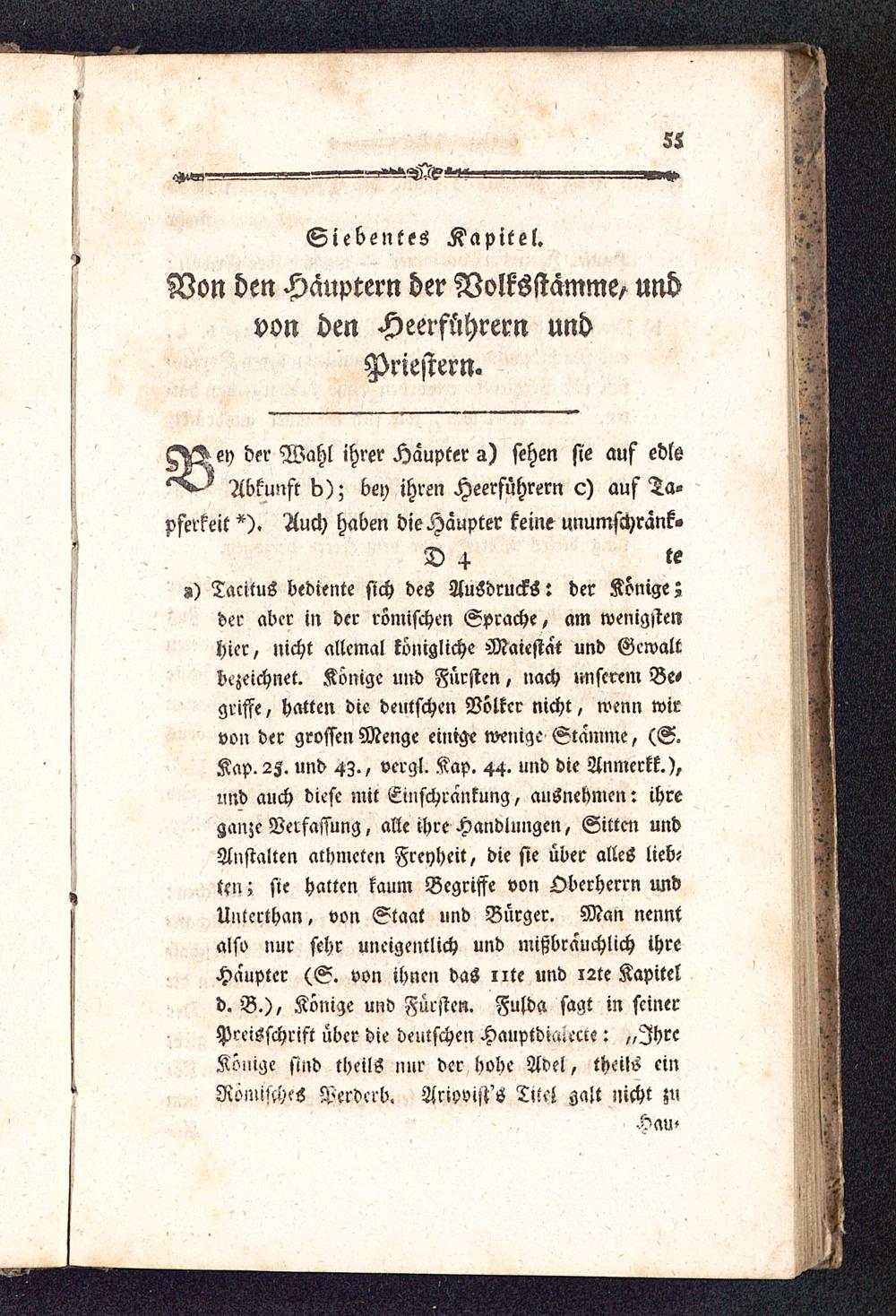 z) Tacitus bediente sich des Ausdrucks: der Könige;der aber in der römischen Sprache, am wenigstenhier, nicht allemal königliche Maiestat und Gewaltbezeichnet. Könige und Fürsten , nach unserem Be<griffe, hatten die deutschen Völker nicht, wenn wirvon der grossen Menge einige wenige Stamme, (S.Kap. 25. und 43., vcrgl. Kap. 44. und die Anmerkt.),und auch diese mit Einschränkung, ausnehmen: ihreganze Verfassung, alle ihre Handlungen, Sitten undAnstalten athmeten Freyheit, die sie über alleS lieb-(en; sie hatten kaum Begriffe von Oberherrn undUnterthan, von Staat und Bürger. Man nenntalso nur sehr uneigentlich und mißbräuchlich ihreHaupter (S. von ihnen das nfc und i2te Kapiteld. B.), Könige und Fürsten. Fulda sagt in seinerPrcisschrift über die deutschen Hauptdi»iccce: „IhreKönige sind theils nur der hohe Adel, theils einRoüttschcs Verderb. Ariyvift's 1\i<i galt nicht zu