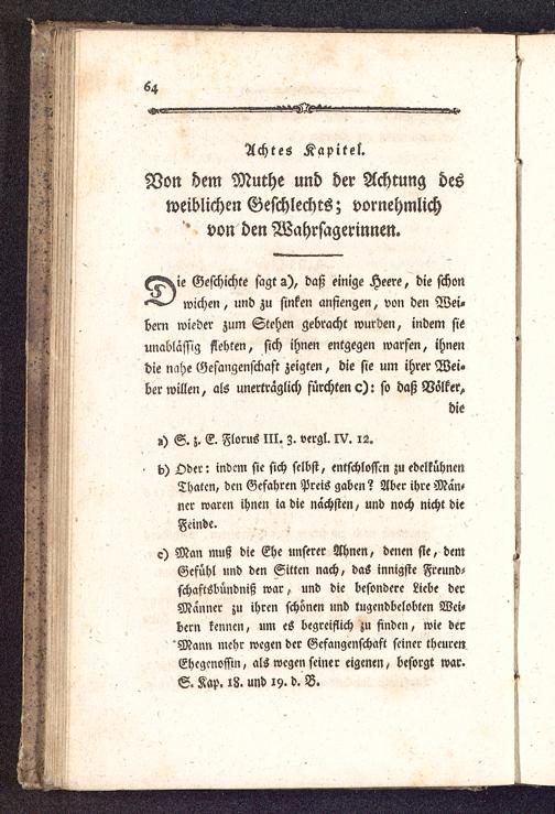c) Man muß die Ehe unserer Ahnen / denen sie, demGefühl und den Sitten nach, daS innigste Freund-schaftsbündniß war, und die besondere Liebe derManner zu ihren schönen und tugendbelobten Wei»bern kennen, um es begreiflich ju finden, wie der"Mann mehr wegen der Gefangenschaft seiner theuren.Ehcgenossin, als wegen seiner eigenen / besorgt war.S. Kap. 18. und 19. d. B.