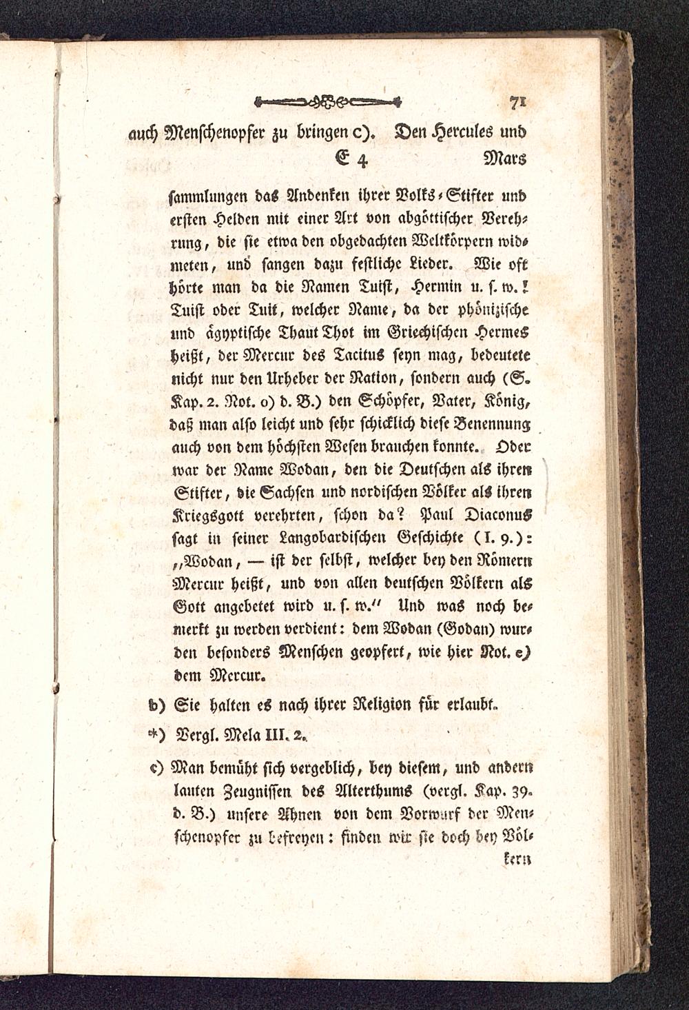 fammlungen das Andenktn ihrer Volks * Stiftet understen Helden mit einer Act von abgöttischer Berch-rung, die sie etwa den obgedachten Wcllkörpcrn wid»meten, un6 sangen dazu festliche Lieder. Wie ofthörte man da die Namen Tuist, Hermin u. s. w.!Tuist oder Tuit, welcher Name, da der phönizischeund ägyptische Tbaut Thot im Griechischen HermeSheißt, der Mercur des TacituS seyn mag, bedeutetenicht nur den Urheber der Ration, sondern auch (S.Kap. 2. Not. 0) d. B.) den Schöpfer, Vater, König,daß man also leicht und sehr schicklich diese Benennungauch von dem höchsten Wesen brauchen konnte. Oderwar der Name Wodan , den die Deutschen als ihrenStifter, die Sachsen und nordischen Völker als ihrenKriegsgott verehrten, schon da? Paul Diaconus sagt in seiner Langobardischeu Geschichte (I. 9.):„Wodan, — ist der selbst, welcher bey den RönlemMercur heißt, und von allen deutschen Völkern alsGott angebetet wird u. f. w." Und waS noch bc-merkt zu werden verdient: dem Wodan (Godan) wur,den besonders Menschen geopfert, wie hier Not. c)dem Mercur.