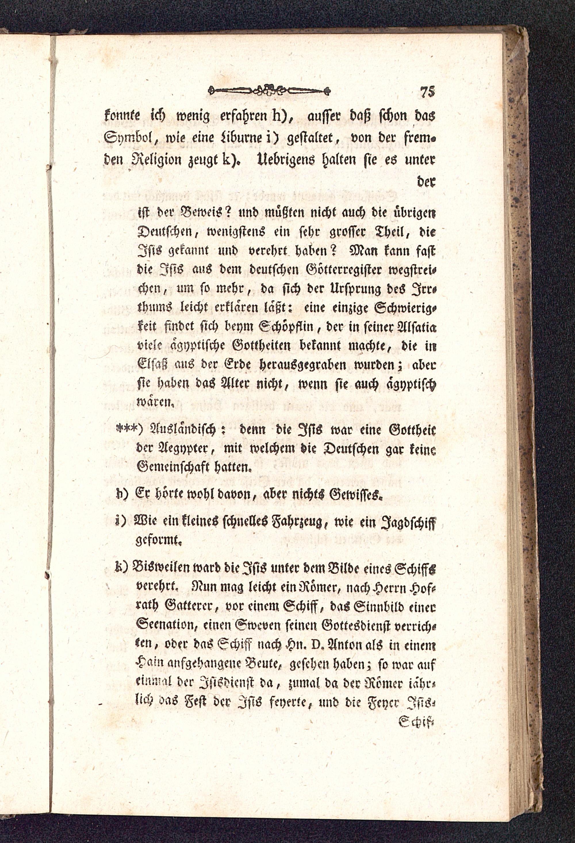fc) Bisweilen ward die Isis unter dem Bilde eines Schiffsverehrt. Nun mag leicht ein Römer, nach Herrn Hof-rath Gattcrer, vor einem Schiff, das Sinnbild einerSecnation, einen Swcven feinen Gottesdienst verrich-ten, oder das Schiff nach Hn. v. Anton als in einemHain anfgehangeue Beute, gesehen haben; so war aufeiüiual der IsiSdicnst da, zumal da der Römer iahc«lich oas Fest der Isis feyerte, und die Feycr Isis-!