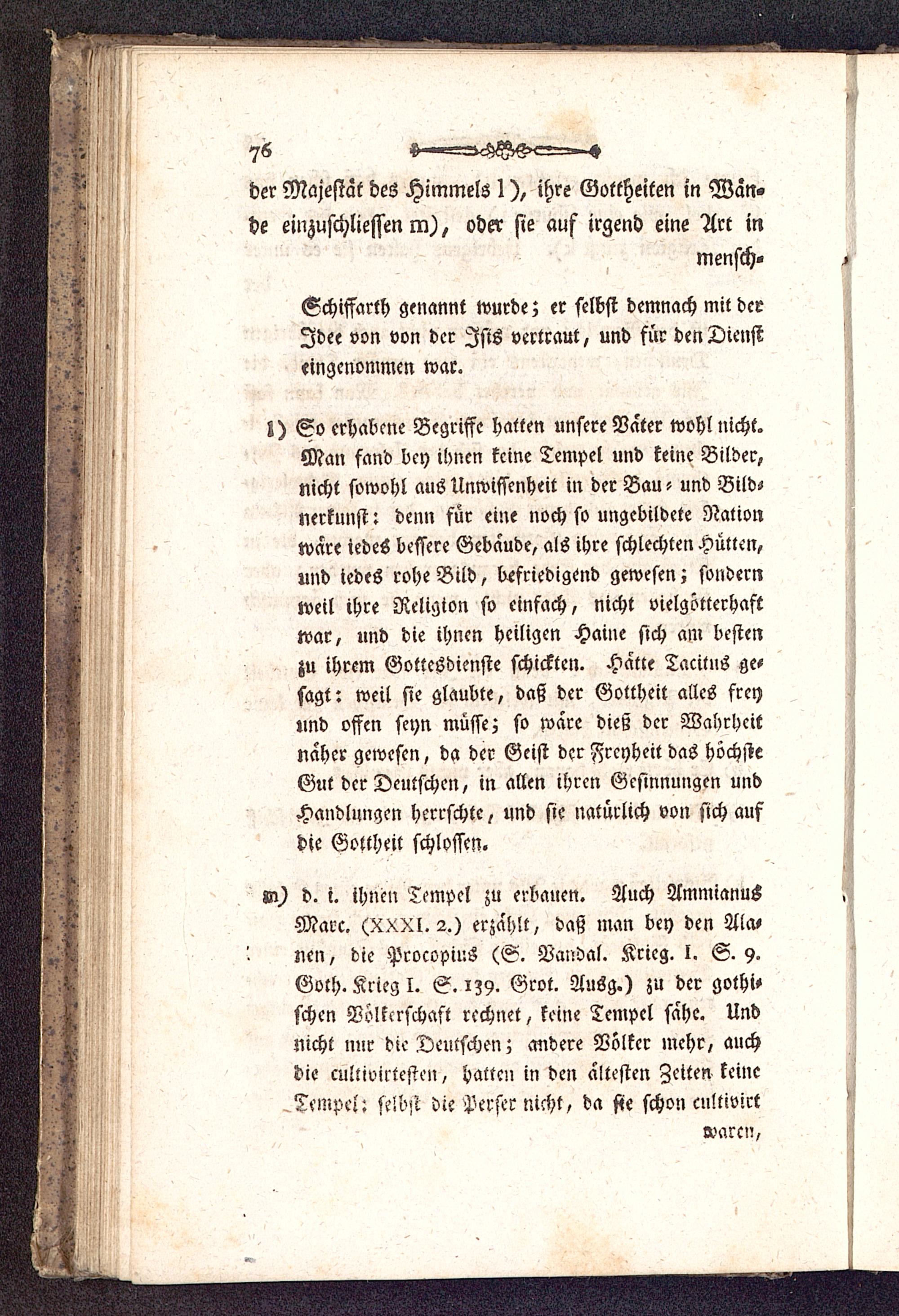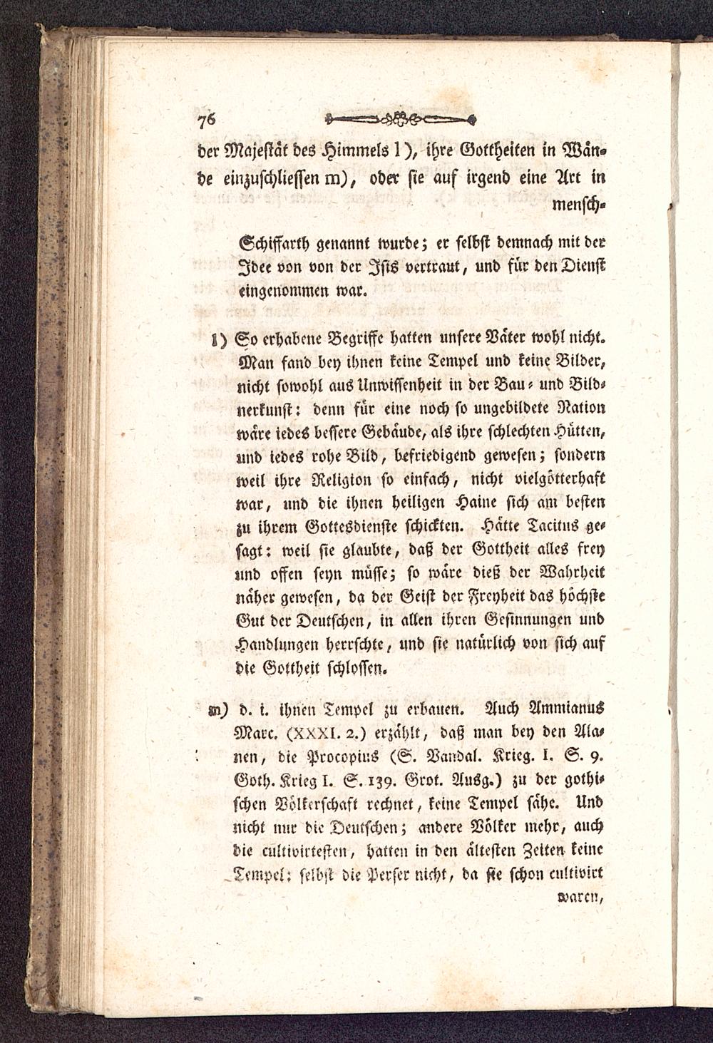 «n) d. i. ihnen Tempel zu erbauen. Auch AmmianusMarc. (XXXl. 2.) erzählt, daß man bey den Ala>ncn, die Pcocopius (S. Vandal. Krieg, l. S. 9.Goth. Krieg I. S. 139. Grot. Ausg.) zu dcr gothi-schen Völkerschaft rechnet, keine Tempel sahe. Undnicht nur die Deutschen; andere Völker mehr, auchdie culliviltesten, hatten in den ältesten Zeiten keine^Tempel: selbst die Perser nicht, da sie schon cultivirt