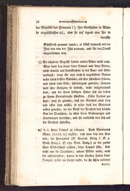 I) So erhabene Begriffe hatten unsere Vater wohl nicht.Man fand bey ihnen keine Tempel und keine Bilder,nicht sowohl aus Unwissenheit in der Bau - und Bild-nerkunst: denn für eine noch so ungebildete Nationwäre icdes bessere Gebäude, als ihre schlechten Hütten,und iedes rohe Bild, befriedigend gewesen; sondernweil ihre Religion so einfach, nicht vielgötterhaftwar, und die ihnen heiligen Haine sich am bestenzu ihrem Gottesdienste schickten. Hatte Tacitns ge-sagt: weil sie glaubte, daß der Gottheit alles frey»ind offen seyn müsse; so wäre dieß dcr Wahrheitnaher gewesen, da der Geist dcr Freyheit das höchsteGut dcr Dcutschen, in allen ihren Gesinnungen undHandlungen herrschte, und sie natürlich von sich aufdie Gottheit schlössen.